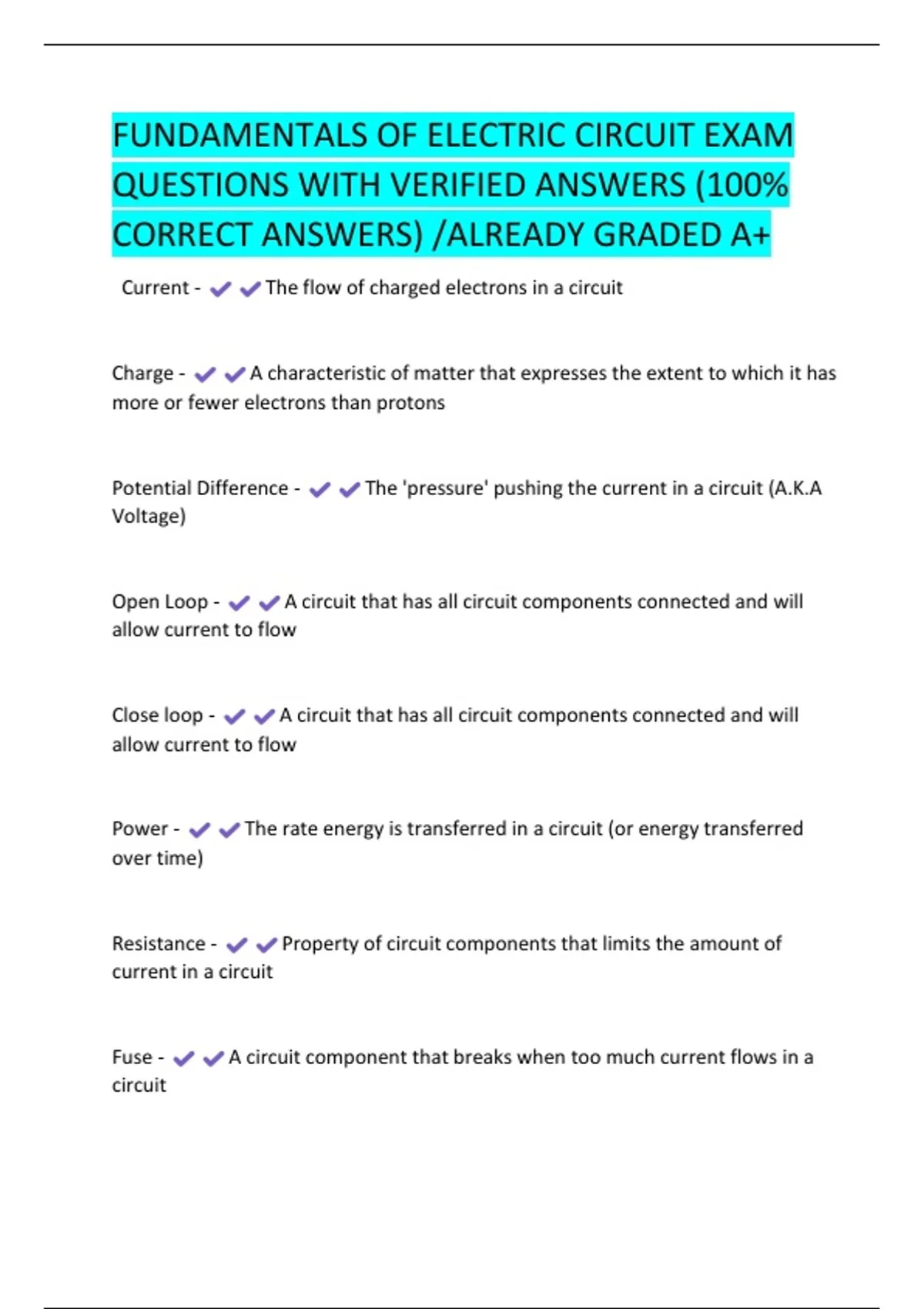 FUNDAMENTALS OF ELECTRIC CIRCUIT EXAM QUESTIONS WITH VERIFIED ANSWERS (100% CORRECT ANSWERS) /ALREADY GRADED A+ Current - Charge - The flow of charged electrons in a circuit A characteristic of matter that expresses the extent to which it has more or fewer electrons than protons Potential Difference - Voltage)
