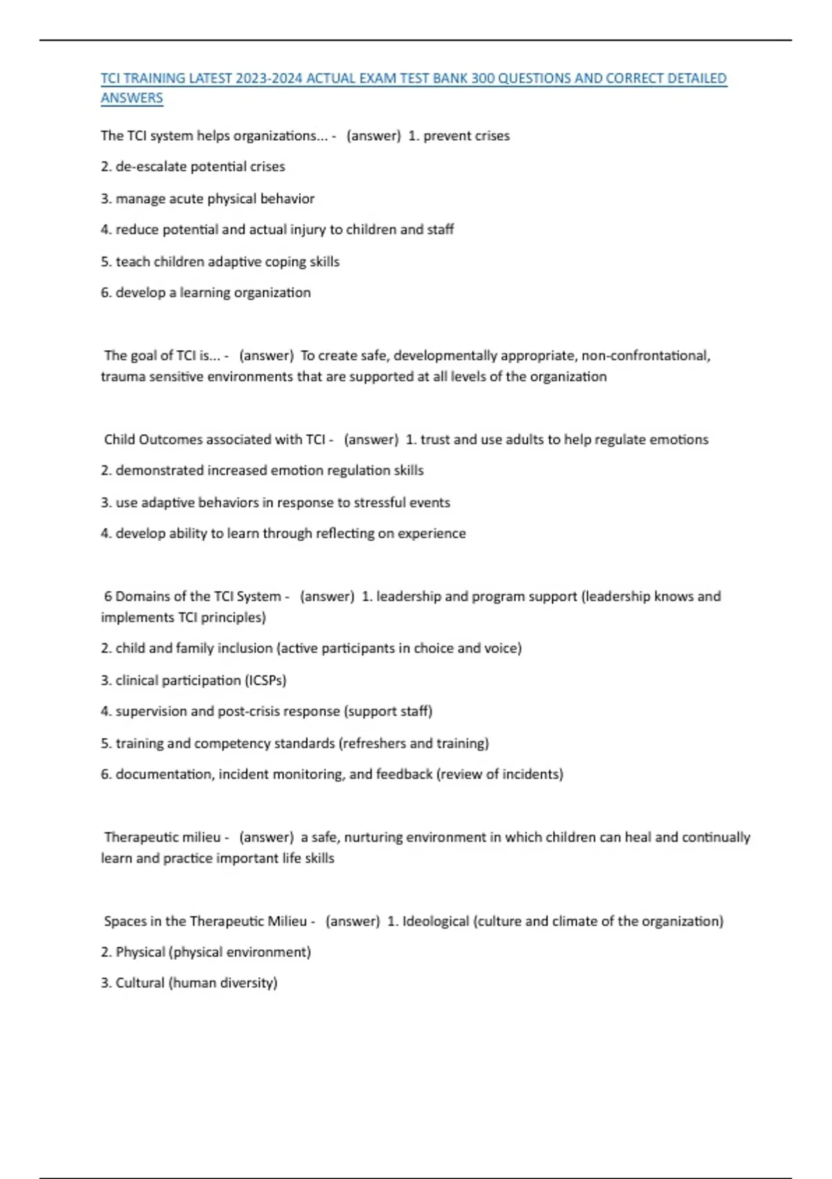 , TCI TRAINING LATEST 2023-2024 ACTUAL EXAM TEST BANK 300 QUESTIONS AND CORRECT DETAILED