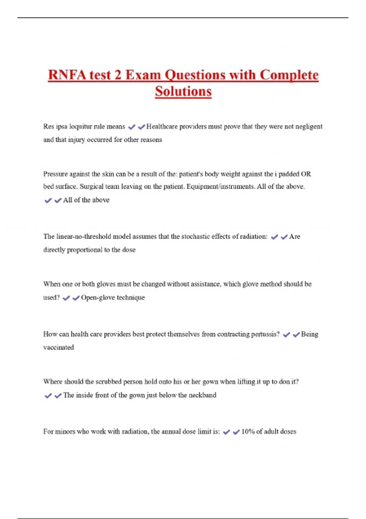 RNFA test 2 Exam Questions with Complete Solutions Res ipsa loquitur rule means Healthcare providers must prove that they were not negligent and that injury occurred for other reasons Pressure against the skin can be a result of the: patient's body weight against the i padded OR bed surface. Surgical team leaving on the patient. Equipment/instruments. All of the above. All of the above The linear-no-threshold model assumes that the stochastic effects of radiation: directly proportional to the dose Are When one or both gloves must be changed without assistance, which glove method should be used? Open-glove technique Res ipsa loquitur rule means Healthcare providers must prove that they were not negligent and that injury occurred for other reasons Pressure against the skin can be a result of the: patient's body weight against the i padded OR bed surface. Surgical team leaving on the patient. Equipment/instruments. All of the above. All of the above The linear-no-threshold model assumes that the stochastic effects of radiation: directly proportional to the dose Are When one or both gloves must be changed without assistance, which glove method should be used? Open-glove technique