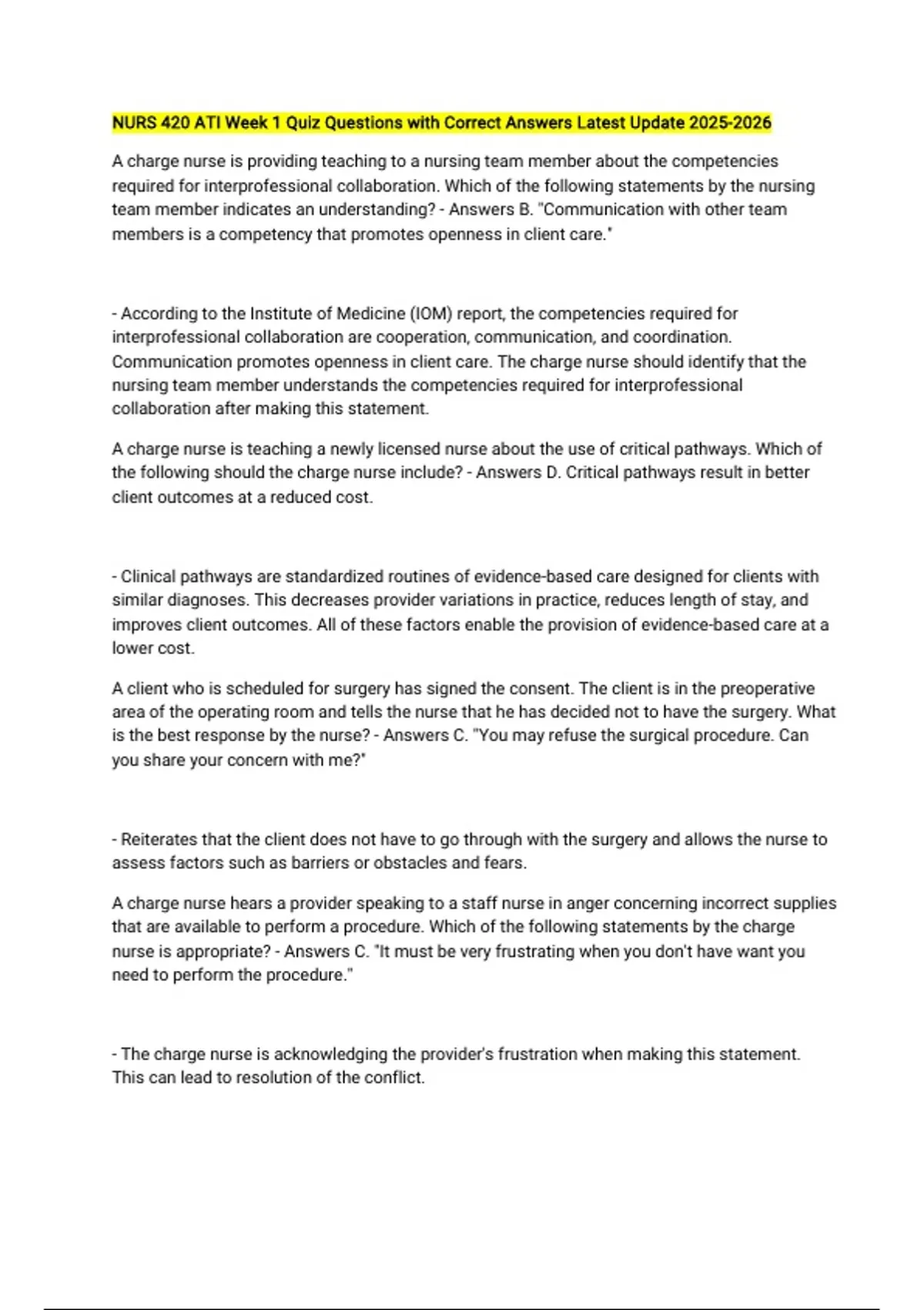 NURS 420 ATI Week 1 Quiz Questions with Correct Answers Latest Update A charge nurse is providing teaching to a nursing team member about the competencies required for interprofessional collaboration. Which of the following statements by the nursing team member indicates an understanding? - Answers B. "Communication with other team members is a competency that promotes openness in client care." - According to the Institute of Medicine (IOM) report, the competencies required for interprofessional collaboration are cooperation, communication, and coordination. Communication promotes openness in client care. The charge nurse should identify that the nursing team member understands the competencies required for interprofessional collaboration after making this statement. A charge nurse is teaching a newly licensed nurse about the use of critical pathways. Which of the following should the charge nurse include? - Answers D. Critical pathways result in better client outcomes at a reduced cost. - Clinical pathways are standardized routines of evidence-based care designed for clients with similar diagnoses. This decreases provider variations in practice, reduces length of stay, and improves client outcomes. All of these factors enable the provision of evidence-based care at a lower cost. A client who is scheduled for surgery has signed the consent. The client is in the preoperative area of the operating room and tells the nurse that he has decided not to have the surgery. What is the best response by the nurse? - Answers C. "You may refuse the surgical procedure. Can you share your concern with me?" - Reiterates that the client does not have to go through with the surgery and allows the nurse to assess factors such as barriers or obstacles and fears. A charge nurse hears a provider speaking to a staff nurse in anger concerning incorrect supplies that are available to perform a procedure. Which of the following statements by the charge nurse is appropriate? - Answers C. "It must be very frustrating when you don't have want you need to perform the procedure." - The charge nurse is acknowledging the provider's frustration when making this statement. This can lead to resolution of the conflict. A charge nurse is preparing a performance improvement plan (PIP) for an assistive personnel (AP) who exhibits negative behavior in the workplace. Which of the following actions by the nurse demonstrates cognitive rehearsal? - Answers B. Practicing in their mind what to say to the AP. - The charge nurse practicing in their mind what to say to the AP is demonstrating cognitive rehearsal. Cognitive rehearsal is an intellectual therapeutic technique of mentally practicing in one's own mind what to say or respond in situations that can be overwhelming or anxiety. A nurse is discussing advancing interprofessional communication on the unit. Which of the following should the nurse identify as a barrier to this advancement? - Answers B. Misunderstanding of roles - The misunderstanding of others' roles is one of the main barriers to advancing interprofessional communication. A clear explanation of each member's role should be shared with the entire team. A nurse manager is preparing an inservice program about managing conflict for the nurses on the unit. The nurse manager should identify which of the following examples as interpersonal conflict? - Answers D. An experienced nurse is uncivil to a newly licensed nurse - Incivility and bullying are examples of interpersonal conflict. Interpersonal conflict arises from differing goals and value systems. A nurse looks up information in a client's medical record but is not involved in the care of the client. The nurse is violating which of the following standards of professional performance? - Answers B. Code of Ethics - Code of ethics outlines rules for nurses that include maintaining client confidentiality, protecting client rights, and being accountable for one's actions. A charge nurse notes that a staff nurse delegates an unfair share of tasks to the assistive personnel (AP) and the nurses on next shift report the staff nurse frequently leaves tasks uncompleted. Which of the following statements should the charge nurse make to resolve this conflict? - Answers A. "I need to talk to you about unit expectations regarding delegating and completing tasks."