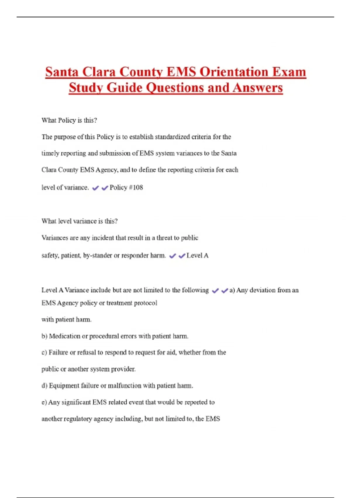 Santa Clara County EMS Orientation Exam Study Guide Questions and Answers What Policy is this? The purpose of this Policy is to establish standardized criteria for the timely reporting and submission of EMS system variances to the Santa Clara County EMS Agency, and to define the reporting criteria for each level of variance. Policy #108 What level variance is this? Variances are any incident that result in a threat to public safety, patient, by-stander or responder harm. Level A