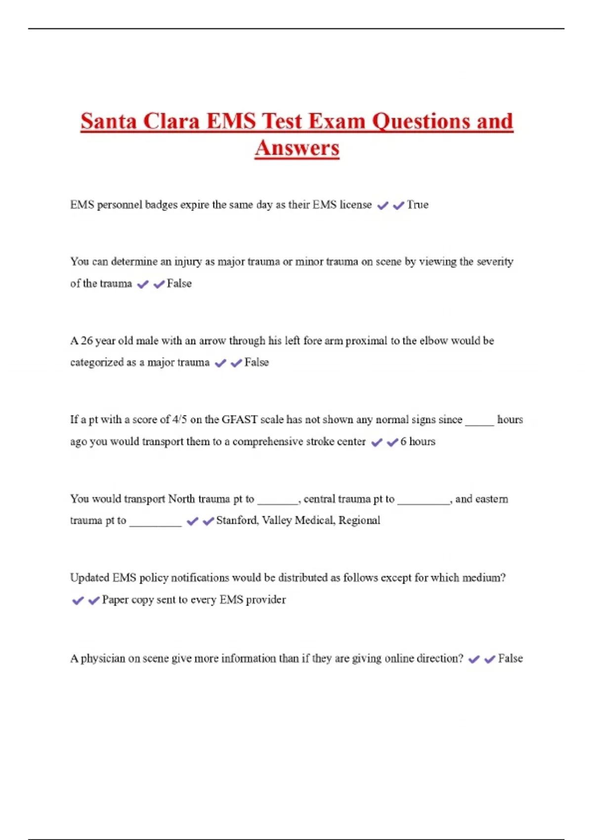 Santa Clara EMS Test Exam Questions and Answers EMS personnel badges expire the same day as their EMS license True You can determine an injury as major trauma or minor trauma on scene by viewing the severity of the trauma False A 26 year old male with an arrow through his left fore arm proximal to the elbow would be categorized as a major trauma False If a pt with a score of 4/5 on the GFAST scale has not shown any normal signs since _____ hours ago you would transport them to a comprehensive stroke center 6 hours