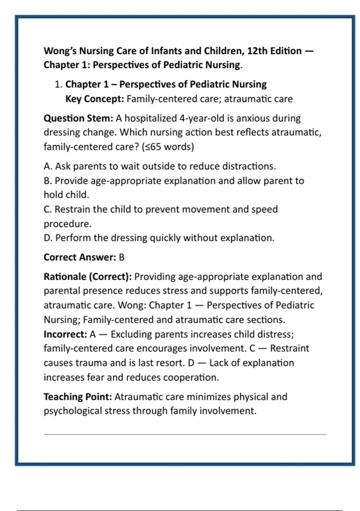 Teaching Point: Atraumatic care minimizes physical and