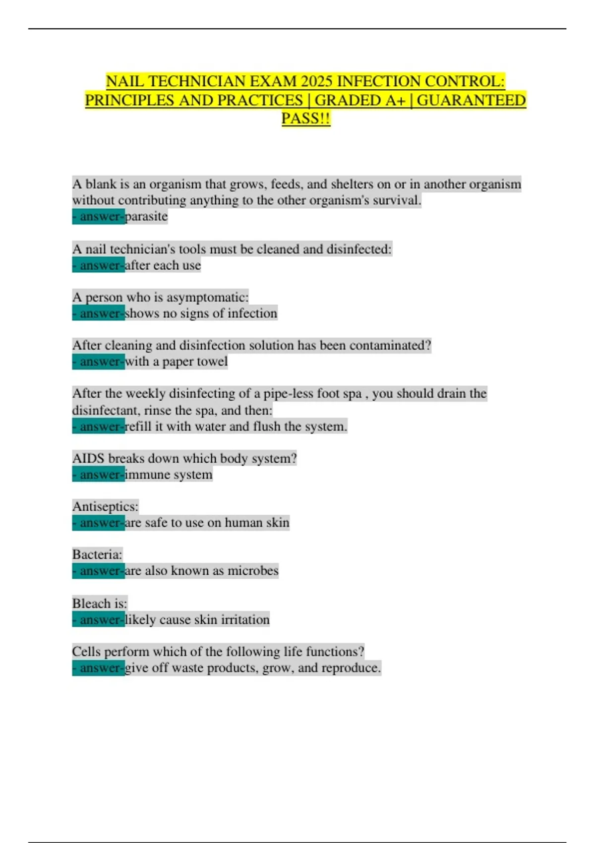 NAIL TECHNICIAN EXAM 2025 INFECTION CONTROL: