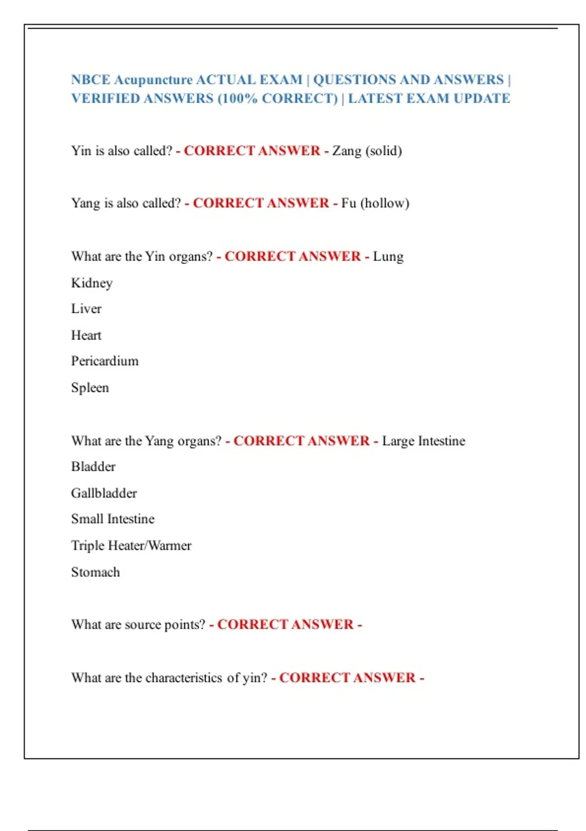NBCE Acupuncture ACTUAL EXAM | QUESTIONS AND ANSWERS | VERIFIED ANSWERS (100% CORRECT) | LATEST EXAM UPDATE