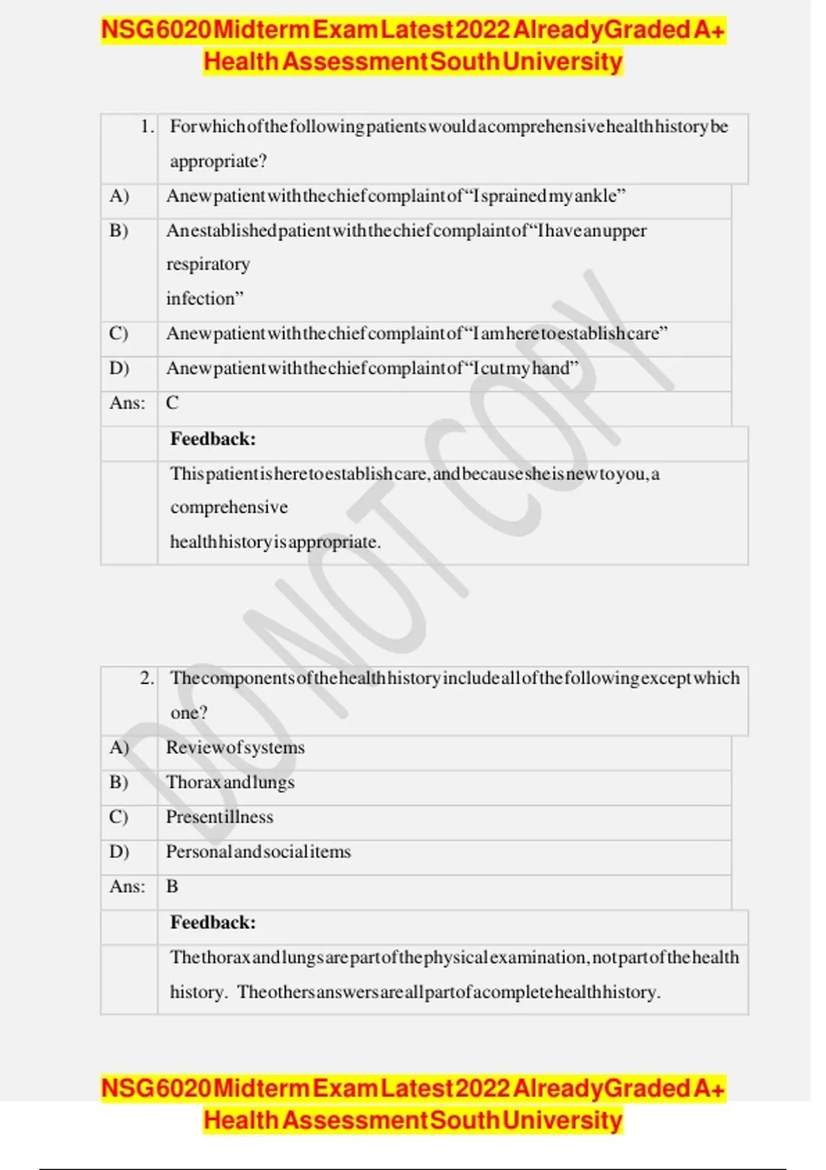NSG 6020 Midterm Exam Latest Already Graded A+ Health Assessment South University