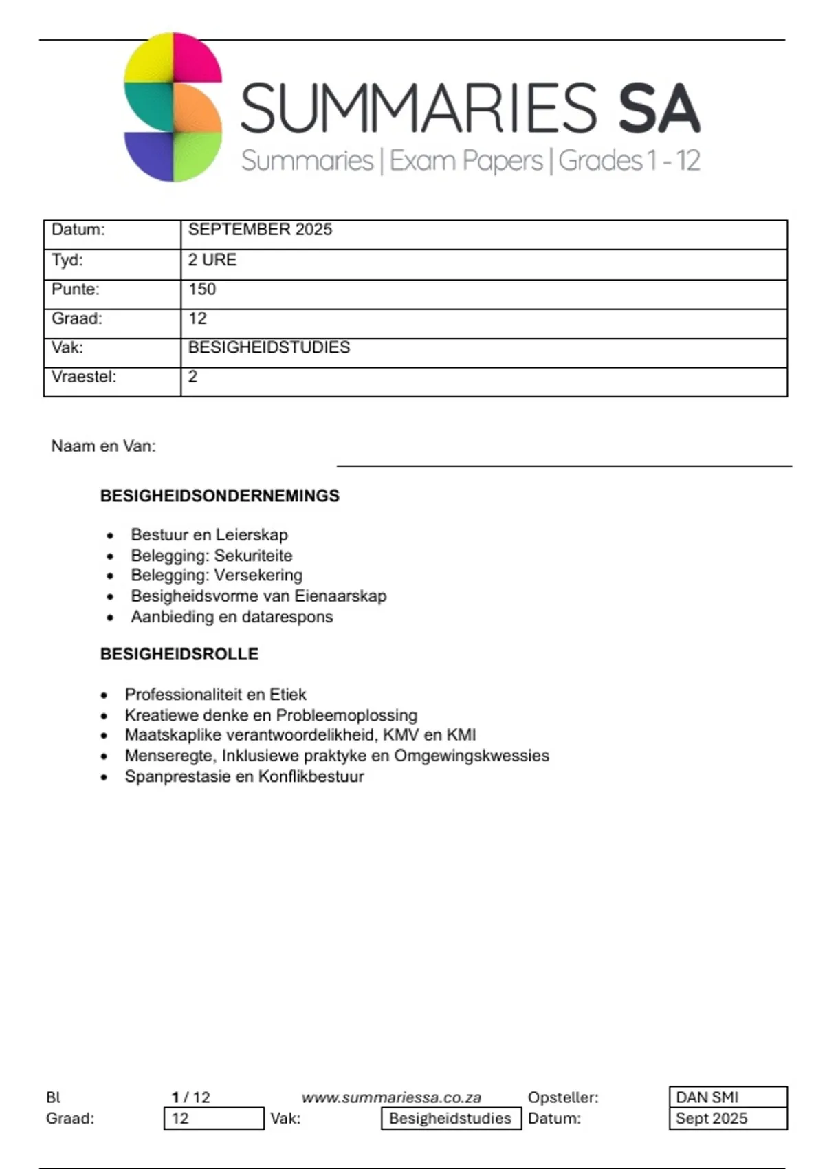 Graad: 12 Vak: Besigheidstudies Datum: Sept 2025