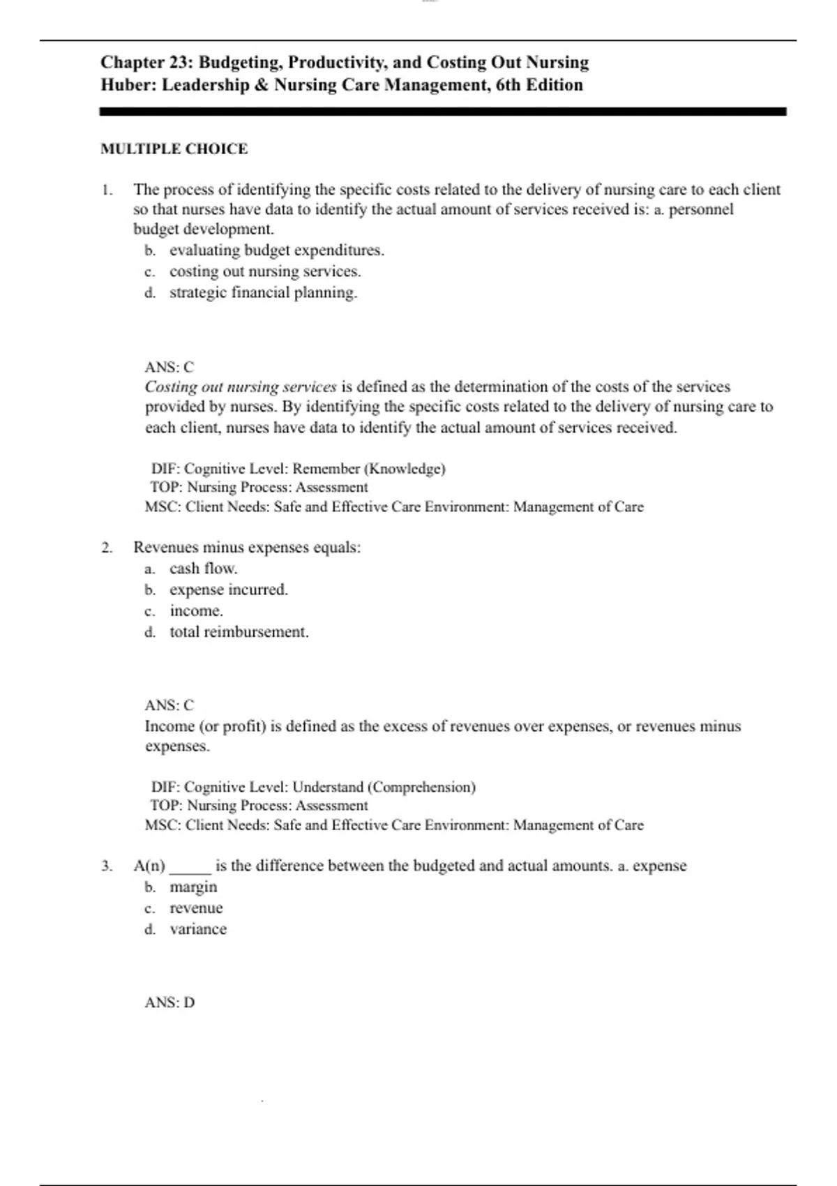 Chapter 23 Budgeting, Productivity, and Costing Out Nursing Questions and Answers with Complete Solutions