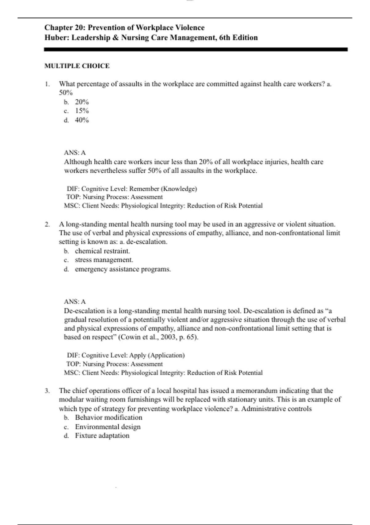 Chapter 20 Prevention of Workplace Violence Questions and Answers with Complete Solutions