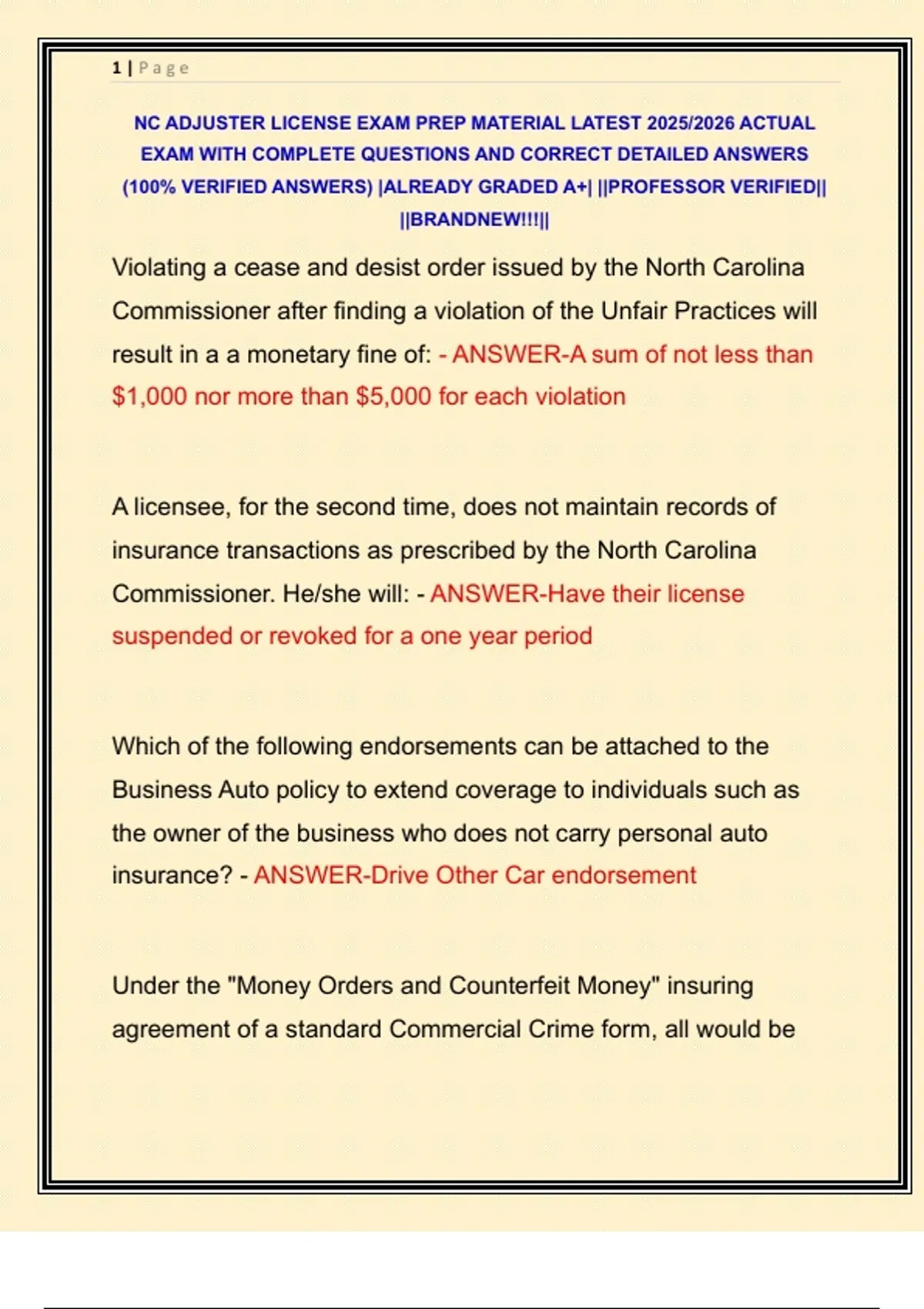NC ADJUSTER LICENSE EXAM PREP MATERIAL LATEST 2025/2026 ACTUAL EXAM WITH COMPLETE QUESTIONS AND CORRECT DETAILED ANSWERS (100% VERIFIED ANSWERS) |ALREADY GRADED A+| ||PROFESSOR VERIFIED|| ||BRANDNEW!!!||