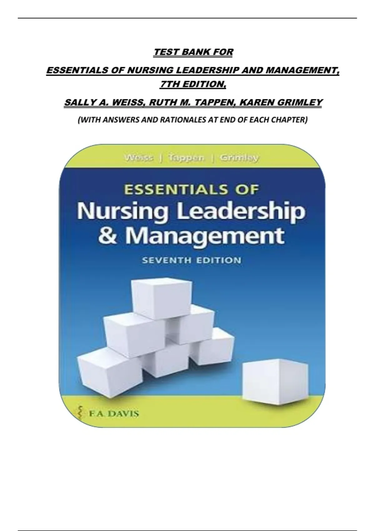 TEST BANK FOR ESSENTIALS OF NURSING LEADERSHIP AND MANAGEMENT, 7TH EDITION, SALLY A. WEISS, RUTH M. TAPPEN, KAREN GRIMLEY (WITH ANSWERS AND RATIONALES AT END OF EACH CHAPTER