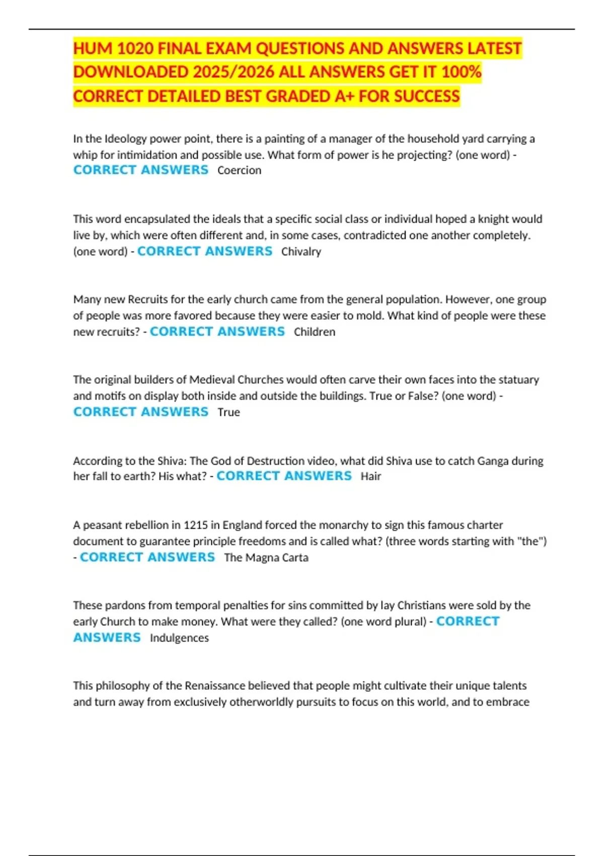 HUM 1020 FINAL EXAM QUESTIONS AND ANSWERS LATEST