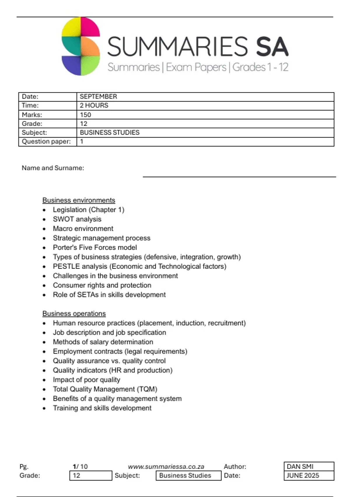 Grade: 12 Subject: Business Studies Date: JUNE 2025