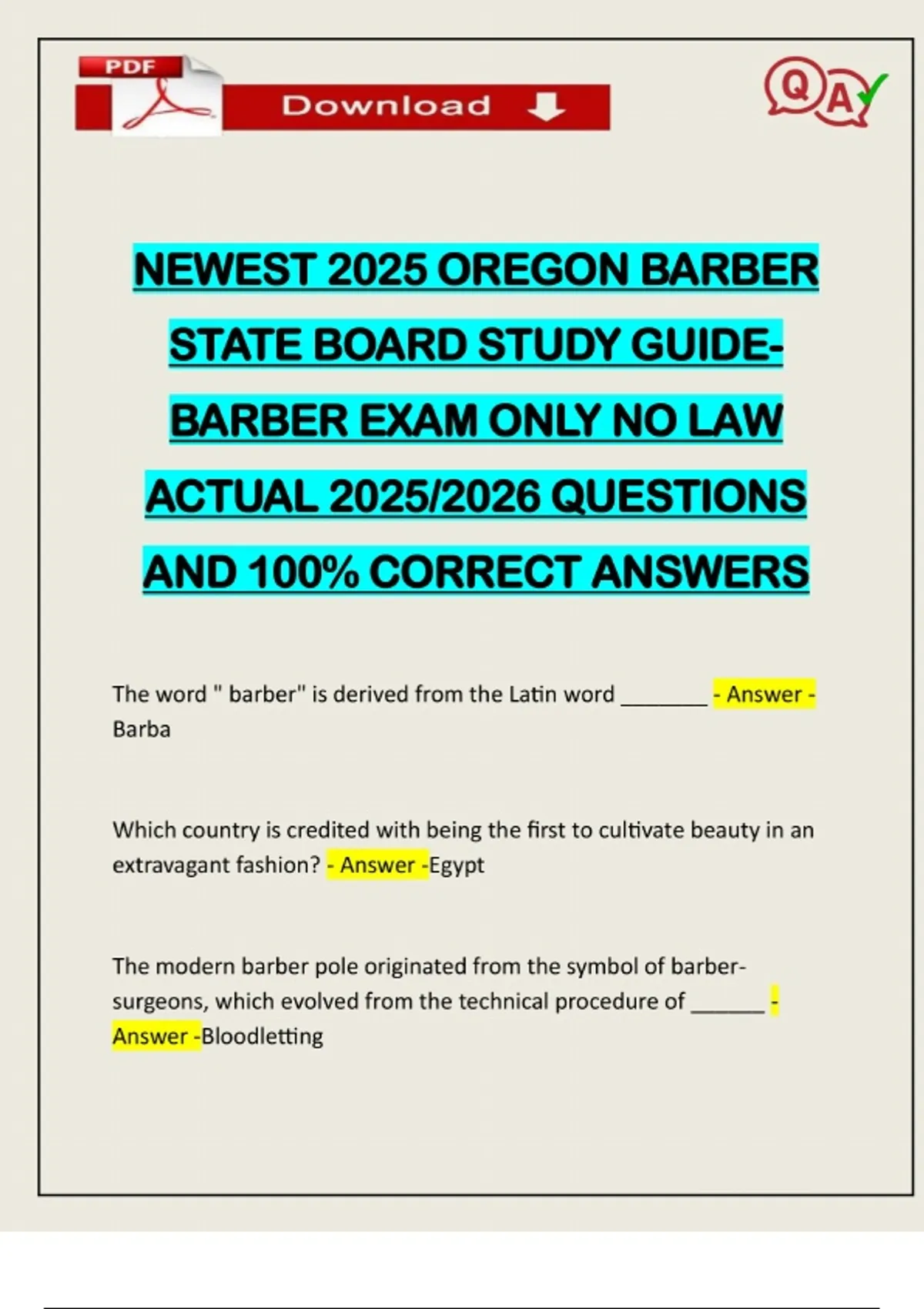 NEWEST 2025 OREGON BARBER STATE BOARD STUDY GUIDEBARBER EXAM ONLY NO LAW ACTUAL 2025/2026 QUESTIONS AND 100% CORRECT ANSWERS The word " barber" is derived from the Latin word _______ - Answer - Barba Which country is credited with being the first to cultivate beauty in an extravagant fashion? - Answer -Egypt The modern barber pole originated from the symbol of barbersurgeons, which evolved from the technical procedure of ______ - Answer -BloodlettingNeed assistance on Online classes, Exams & Assignments? Reach out for instant help!! Full Course Assistance, Plagiarism-free Essay Writing, Research Paper, Dissertation, Discussion Posts, etc…. Confidential & Secure services. Tutors are available for all subjects! Email now at: Which ethnic groups brought barber-surgeons to America? - Answer - Swedish and Dutch immigrants Who was the author of the first barbering textbook and was published by ______? - Answer -A.B. Moler Minnesota was the first state to pass a barber license law in what year? - Answer -1897 The study of human characteristics for a specific work environment is _____? - Answer -Ergonomics