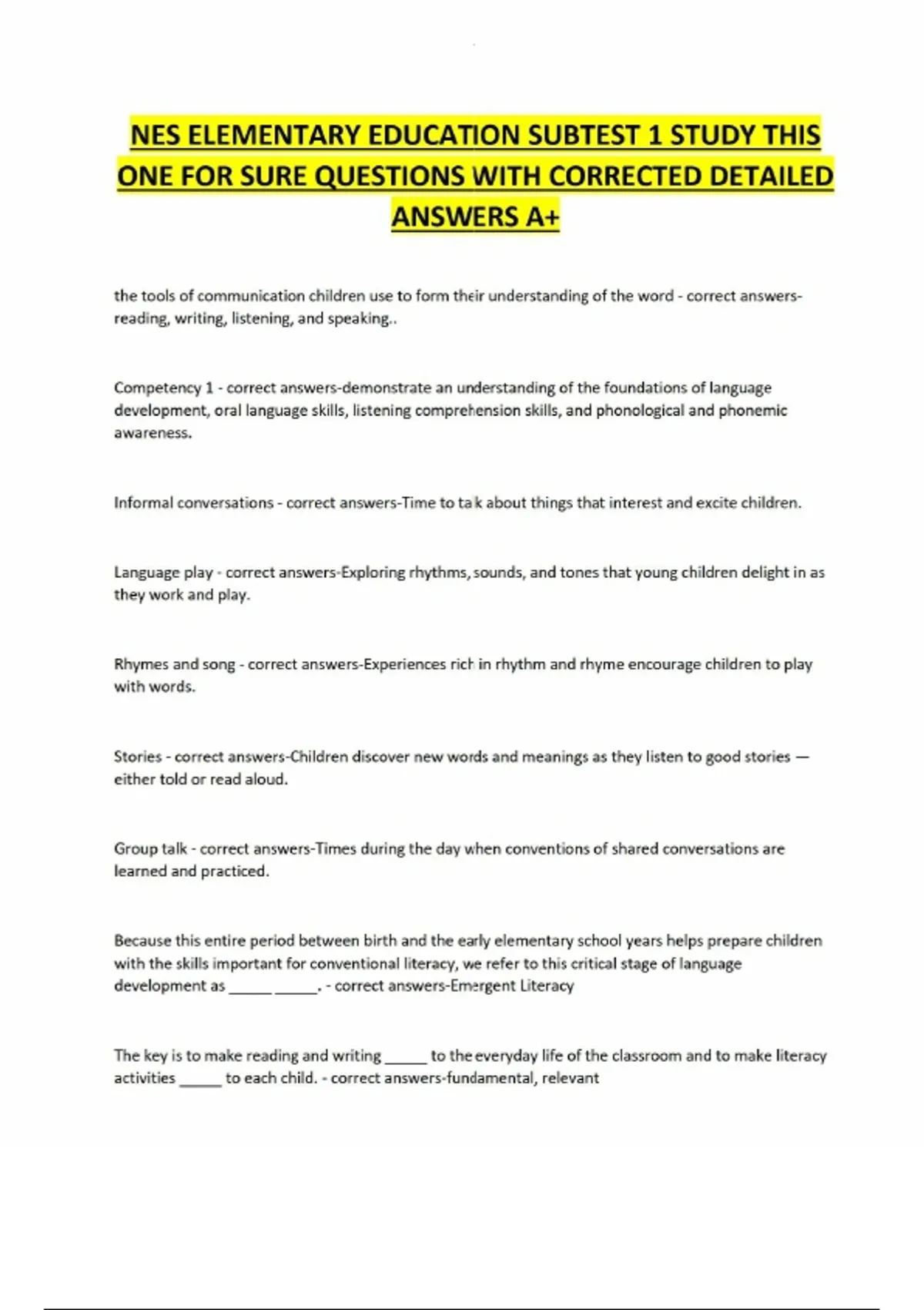 NES ELEMENTARY EDUCATION SUBTEST 1 STUDY THIS ONE FOR SURE QUES NES ELEMENTARY EDUCATION SUBTEST 1 STUDY THIS ONE FOR SURE QUESTIONS WITH CORRECTED DETAILED ANSWERS A+TIONS WITH CORRECTED DETAILED ANSWERS A+