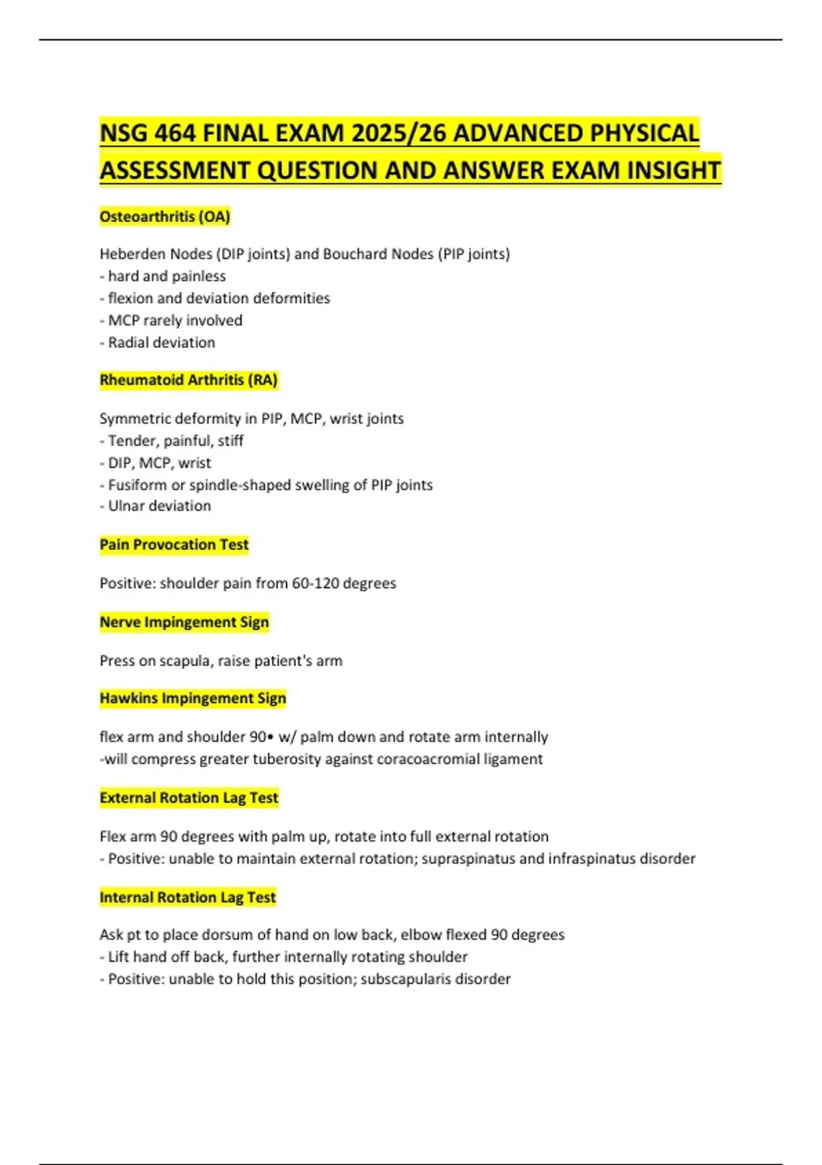 NSG 464 FINAL EXAM 2025/26 ADVANCED PHYSICAL ASSESSMENT QUESTION AND ANSWER EXAM INSIGHT