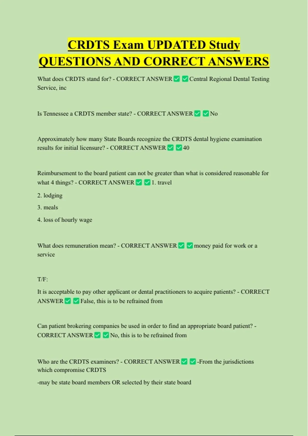 CRDTS Exam UPDATED Study QUESTIONS AND CORRECT ANSWERS What does CRDTS stand for? - CORRECT ANSWER Service, inc Central Regional Dental Testing Is Tennessee a CRDTS member state? - CORRECT ANSWER No Approximately how many State Boards recognize the CRDTS dental hygiene examination results for initial licensure? - CORRECT ANSWER 40