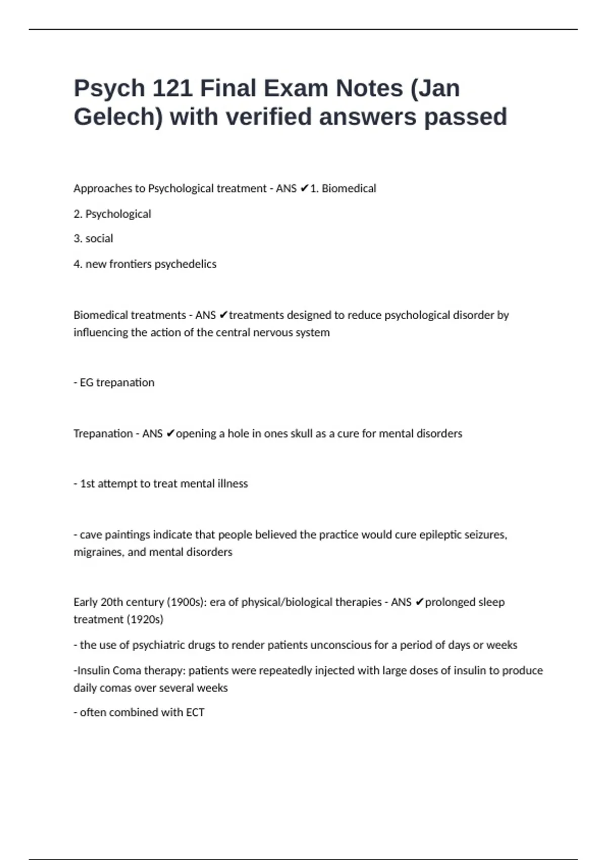 Psych 121 Final Exam Notes (Jan Gelech) with verified answers passed