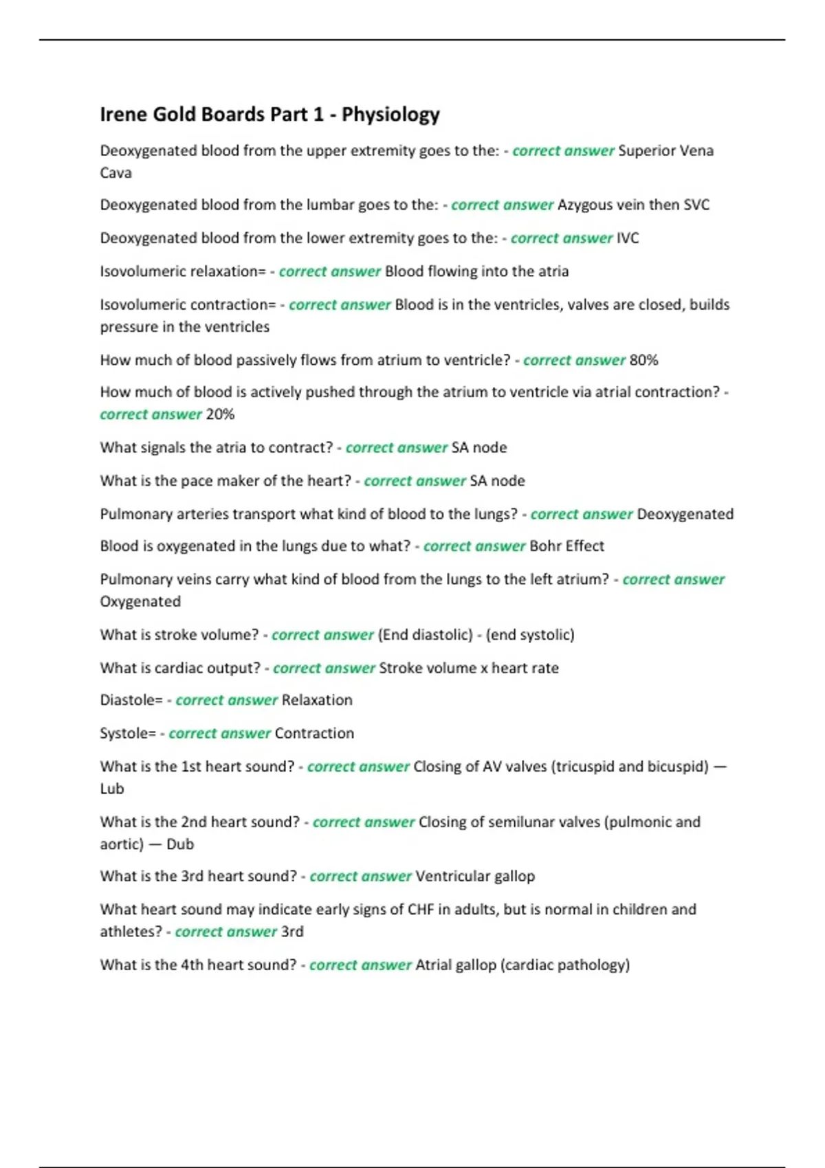 Deoxygenated blood from the upper extremity goes to the: - correct answer Superior Vena Cava Deoxygenated blood from the lumbar goes to the: - correct answer Azygous vein then SVC Deoxygenated blood from the lower extremity goes to the: - correct answer IVC Isovolumeric relaxation= - correct answer Blood flowing into the atria Isovolumeric contraction= - correct answer Blood is in the ventricles, valves are closed, builds pressure in the ventricles How much of blood passively flows from atrium to ventricle? - correct answer 80% How much of blood is actively pushed through the atrium to ventricle via atrial contraction? - correct answer 20% What signals the atria to contract? - correct answer SA node What is the pace maker of the heart? - correct answer SA node