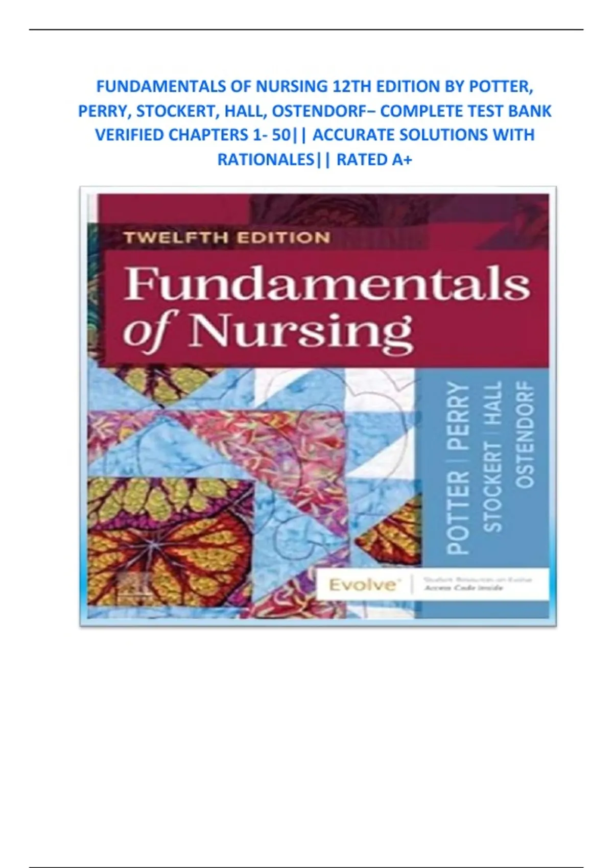 FUNDAMENTALS OF NURSING 12TH EDITION BY POTTER, PERRY, STOCKERT, HALL, OSTENDORF− COMPLETE TEST BANK VERIFIED CHAPTERS 1- 50|| ACCURATE SOLUTIONS WITH RATIONALES|| RATED A+ FUNDAMENTALS OF NURSING 12TH EDITION BY POTTER, PERRY, STOCKERT, HALL, OSTENDORF− COMPLETE TEST BANK VERIFIED CHAPTERS 1- 50|| ACCURATE SOLUTIONS WITH RATIONALES|| RATED A+
