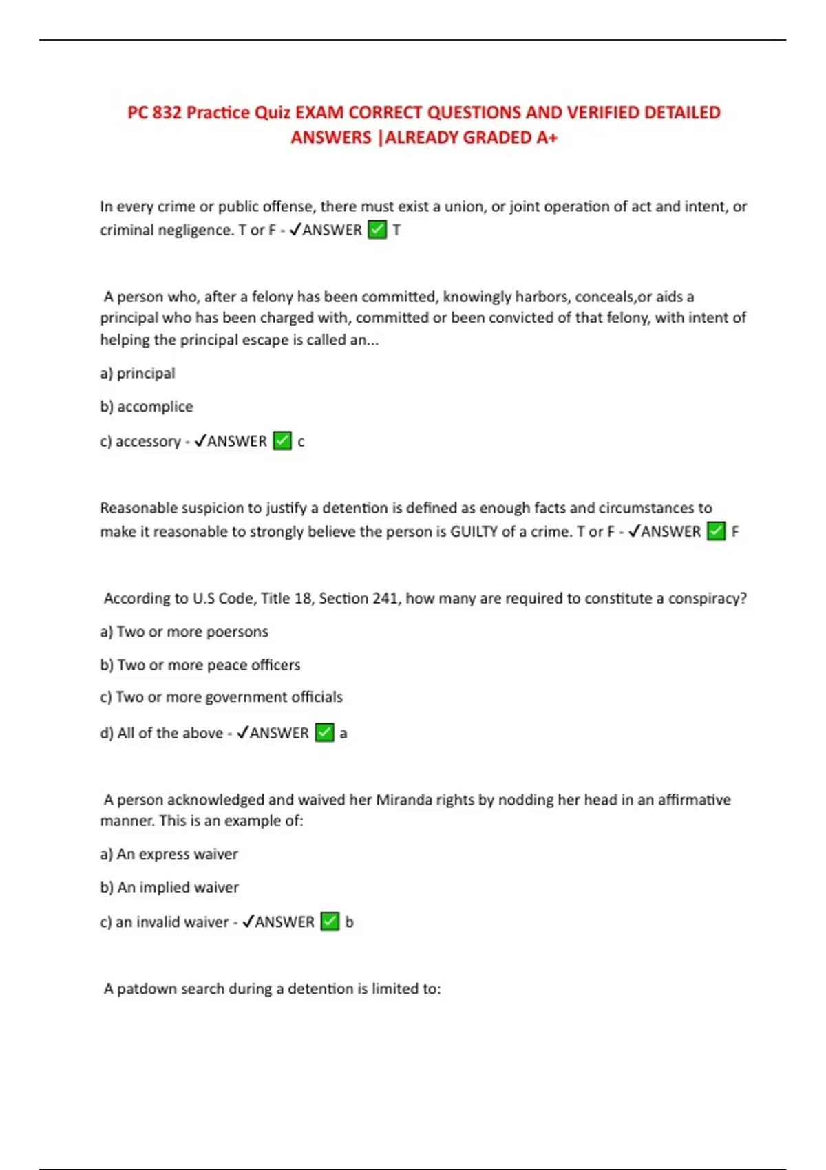 In every crime or public offense, there must exist a union, or joint operation of act and intent, or criminal negligence. T or F - ANSWER T A person who, after a felony has been committed, knowingly harbors, conceals,or aids a principal who has been charged with, committed or been convicted of that felony, with intent of helping the principal escape is called an... a) principal b) accomplice c) accessory - ANSWER c Reasonable suspicion to justify a detention is defined as enough facts and circumstances to make it reasonable to strongly believe the person is GUILTY of a crime. T or F - ANSWER F According to U.S Code, Title 18, Section 241, how many are required to constitute a conspiracy? a) Two or more poersons b) Two or more peace officers c) Two or more government officials d) All of the above - ANSWER a A person acknowledged and waived her Miranda rights by nodding her head in an affirmative manner. This is an example of: a) An express waiver b) An implied waiver c) an invalid waiver - ANSWER b A patdown search during a detention is limited to: a) Search for weapons b) Search for outer clothing c) Manipulation of a large object in the detainees sock to determine if it is a weapon d) All of the above - ANSWER d Johnson resembled an individual suspected of robbing a convenience store. He was stopped by police and asked investigative questions concerning his whereabouts at the time of the robbery. Johnson refused to answer the questions. The detention may now be elevated to an arrest? T or F - ANSWER F In order to protect their Fifth Amendment Right against self-incrimination, Peace Officers must provide Miranda warnings to individuals about to undergo: a) Custodial interrogation b) An information gathering interview c) Questioning during a detention d) All of the above - ANSWER a Arrest is defined by what? a) Taking a person into custody b) Detaining an individual for more than four hours c) Reading an individual their Miranda rights. d) Both a) and c) - ANSWER a Which of the actions below is considered appropriate for a peace officer to take during the detention of a robbery suspect? a) Asking questions about identity and conduct b) Patdown search of outer clothing c) Bringing victim to suspect for identification d) All of the above e) Only a) and b) - ANSWER d A woman renting an apartment refused to pay rent for two months, stating the landlord had failed to provide heat in her apartment. The landlord called an officer to remove the tenant. Should the officer treat this as a civil or criminal matter? - ANSWER Civil The right to ABSOLUTE privacy is one of the fundamental rights guaranteed by the Bill of Rights? T or F - ANSWER F Search and arrest warrants must show probable cause and must also particularly state items or persons to be searched or seized. Peace Officers must always adhere to the constraints of the warrant. T or F - ANSWER T Mr. Guzman was living in a drug treatment center. In his room he had several suitcases in which he kept his personal property. Police came to the center and asked the Facility Director for consent to search Mr. Guzman's property. It was appropriate for the Facility Director to give consent to the police to search Guzman's suitcases? T or F - ANSWER F Can a person's failure to act constitute a crime? Y or N - ANSWER Y