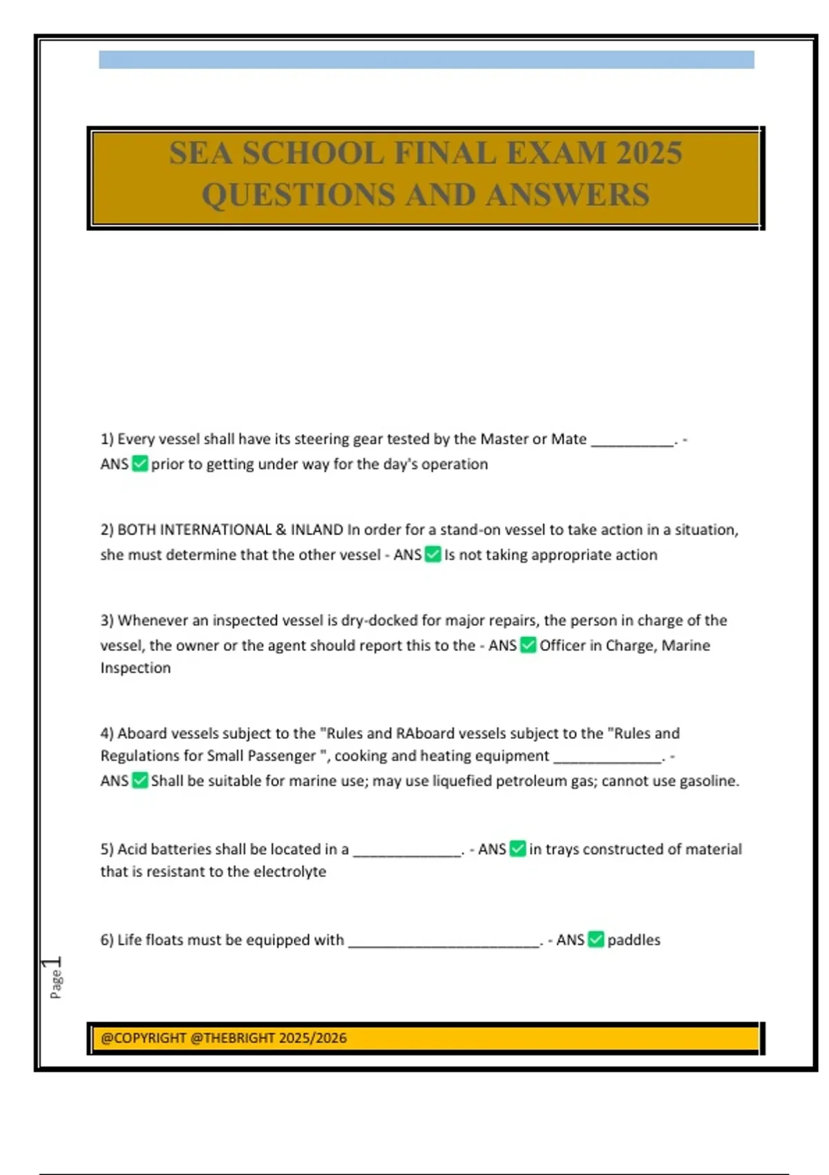 1) Every vessel shall have its steering gear tested by the Master or Mate __________. - ANS prior to getting under way for the day's operation 2) BOTH INTERNATIONAL & INLAND In order for a stand-on vessel to take action in a situation, she must determine that the other vessel - ANS Is not taking appropriate action 3) Whenever an inspected vessel is dry-docked for major repairs, the person in charge of the vessel, the owner or the agent should report this to the - ANS Officer in Charge, Marine Inspection 4) Aboard vessels subject to the "Rules and RAboard vessels subject to the "Rules and Regulations for Small Passenger ", cooking and heating equipment _____________. - ANS Shall be suitable for marine use; may use liquefied petroleum gas; cannot use gasoline. 5) Acid batteries shall be located in a _____________. - ANS in trays constructed of material that is resistant to the electrolyte 6) Life floats must be equipped with _______________________. - ANS paddles SEA SCHOOL FINAL EXAM 2025 QUESTIONS AND ANSWERS @COPYRIGHT @THEBRIGHT 2025/2026 Page2 7) Where must the draft or loading marks be placed on a small passenger vessel? - ANS At each end of the vessel 8) INTERNATIONAL ONLY In a crossing situation on International waters, a short blast by the give-way vessel indicates that the vessel - ANS Is turning to starboard 9) While serving as Master on board your vessel, your license must be - ANS in your possession on board the vessel 10) Which statement is TRUE concerning the number of portable fire extinguishers required in the pilothouse of a small passenger vessel? - ANS One B-I extinguisher is required 11) INTERNATIONAL ONLY In a crossing situation on International waters, a short blast by the give-way vessel indicates that the vessel - ANS Is turning to starboard 12) A length of fire hose shall be _____________. - ANS attached to each fire hydrant at all times 13) Whenever an inspected vessel is dry-docked for major repairs, the person in charge of the vessel, the owner or the agent should report this to the - ANS Officer in Charge, Marine Inspection 14) BOTH INTERNATIONAL & INLAND You are underway approaching another vessel and see only sidelights on the other vessel. This is a(n): - ANS A vessel sailing 15) How many portable fire extinguishers are required in the propulsion machinery space of a diesel powered vessel if there is a fixed CO2 system installed onboard? - ANS None are required @COPYRIGHT @THEBRIGHT 2025/2026 Page3 16) A Certificate of Inspection issued to a small passenger vessel describes - ANS All the above 17) All life jackets and life buoys shall be marked with the vessel's name in letters at least ____________. (small passenger vessel regulations) - ANS Height not specified 18) BOTH INTERNATIONAL & INLAND Failure to understand the course or intention of an approaching vessel should be indicated by - ANS Not less than five short blasts 19) What Rule of the Road do you feel was not followed, and caused the Bayside Blaster accident? - ANS Rule 6 20) When would it NOT be necessary to immediately notify the U.S. Coast Guard? - ANS Damage amounting to $2,000 21) On board a small passenger vessel, fuel tank vents should ___________. - ANS Be connected at the highest point in the tank. Terminate in a U-bend fitted with a single corrosion resistant wire screen of at least 30x30 mesh. Be installed with an upward gradient to prevent fuel from being tr