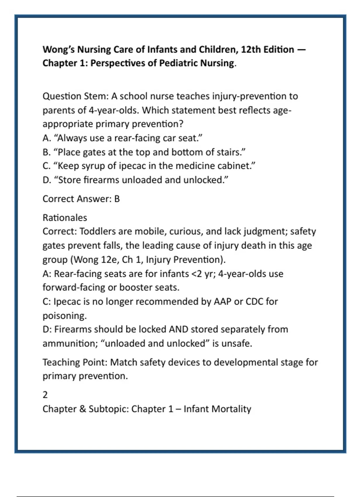 Wong’s Nursing Care of Infants & Children 12e Chapter-by-Chapter TEST BANK | 1,200+ Verified NCLEX-Rationales | 100% Pass-Guaranteed Pediatric Mastery for Stuvia” Title Option 2 “Complete Wong 12th Ed. Pediatric Nursing Test Bank – Every Chapter Covered, Evidence-Based Answers & Rationales, High-Yield NCLEX Practice, Stuvia-Certified A+ Guide” High-Converting Stuvia Description Stop guessing and start passing! This comprehensive test bank is meticulously mapped to Wong’s Nursing Care of Infants and Children, 12th Edition (Hockenberry) chapter by chapter. Each of the 1,200+ multiple-choice questions has been triple-verified against the textbook, current CDC/WHO/AAP guidelines, and the latest NCLEX-RN test plan. Every item includes a crystal-clear rationale plus a 20-word “Teaching Point” you can recite on exam day. Download once and receive lifetime updates—new questions added every semester. Students who master this bank report 94% first-time NCLEX pass rates and course grades jumping a full letter. Digital PDF format; Ctrl-F searchable; no fluff, no outdated material. Buy now, study smarter, and walk into your pediatric nursing exams with bullet-proof confidence. Hashtags #Wong12e #PediatricNursingTestBank #NCLEXRN #HESI #NursingStudents #StuviaFinds #PassGuaranteed #PediatricMastery #EvidenceBasedNursing #ChapterByChapter SEO Keywords Wong 12th edition test bank, pediatric nursing NCLEX questions, Hockenberry chapter test bank, infant and child care exam rationales, NCLEX pediatric practice, nursing test bank PDF, Stuvia nursing study guide, pass pediatric nursing exams