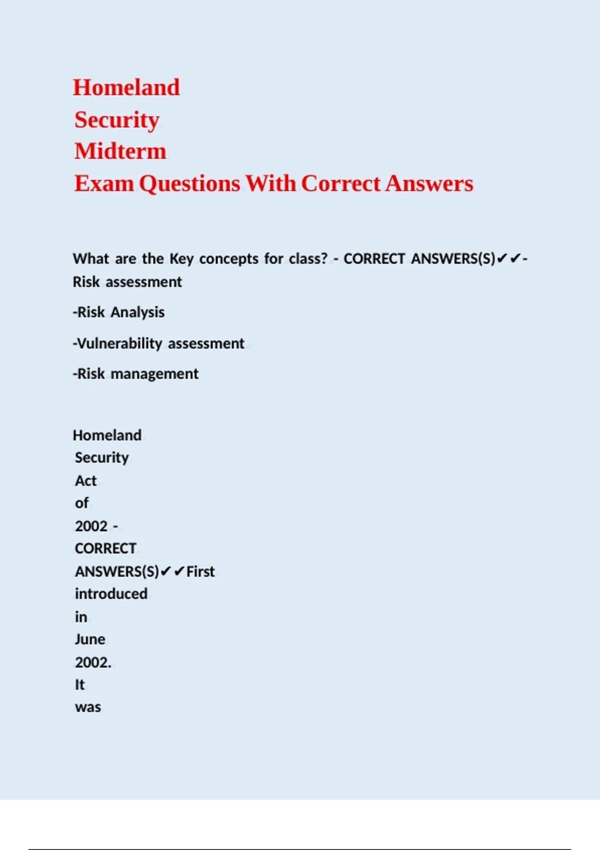 Homeland Security Midterm Exam Questions With Correct Answers.