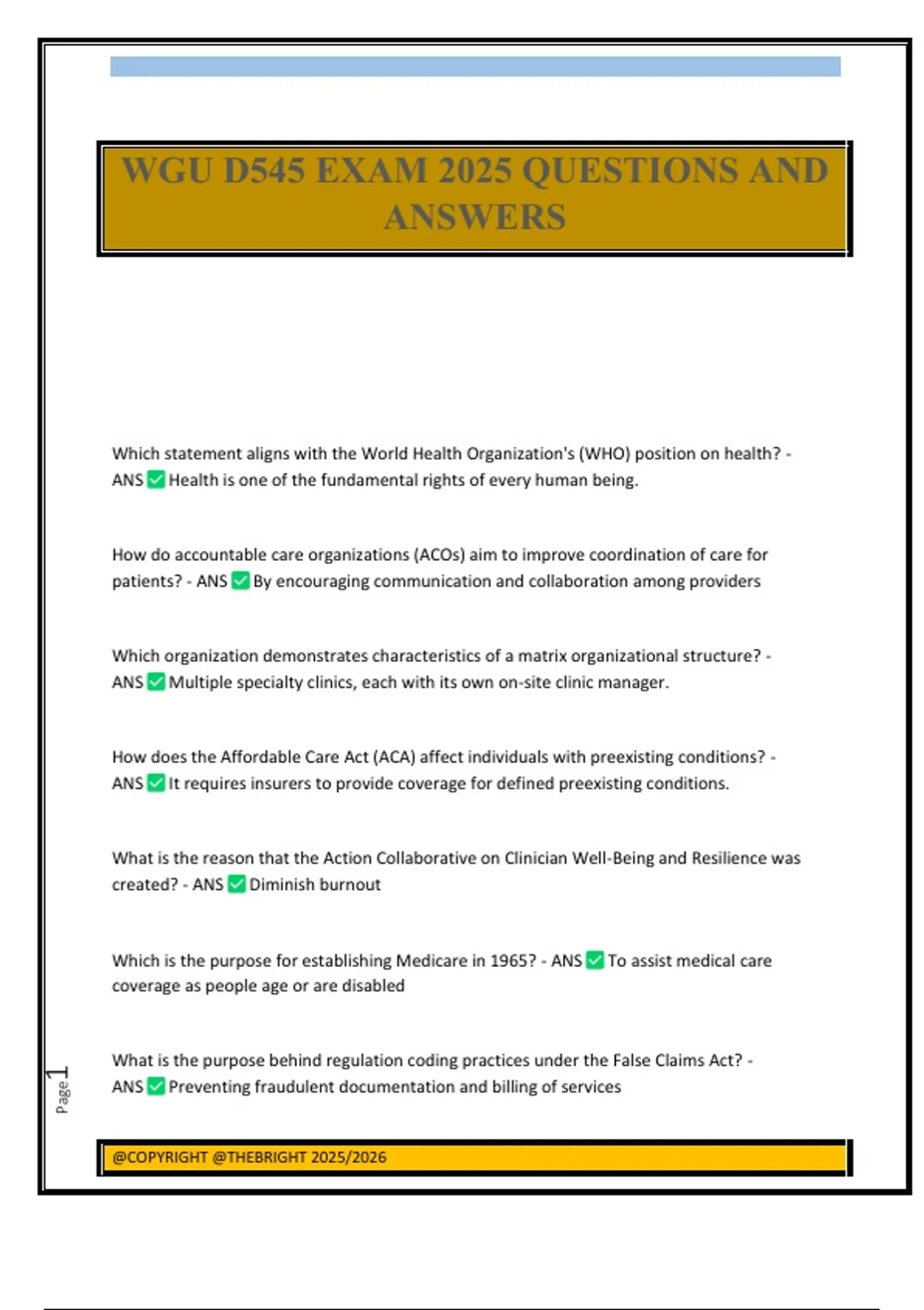 Which statement aligns with the World Health Organization's (WHO) position on health? - ANS Health is one of the fundamental rights of every human being. How do accountable care organizations (ACOs) aim to improve coordination of care for patients? - ANS By encouraging communication and collaboration among providers Which organization demonstrates characteristics of a matrix organizational structure? - ANS Multiple specialty clinics, each with its own on-site clinic manager. How does the Affordable Care Act (ACA) affect individuals with preexisting conditions? - ANS It requires insurers to provide coverage for defined preexisting conditions. What is the reason that the Action Collaborative on Clinician Well-Being and Resilience was created? - ANS Diminish burnout Which is the purpose for establishing Medicare in 1965? - ANS To assist medical care coverage as people age or are disabled What is the purpose behind regulation coding practices under the False Claims Act? - ANS Preventing fraudulent documentation and billing of services WGU D545 EXAM 2025 QUESTIONS AND ANSWERS @COPYRIGHT @THEBRIGHT 2025/2026 Page2 What was the relationship between changing demographics in the US and the Medicare Monetization Act (MMA) of 2003? - ANS An aging population led to increased prescription coverage under the MMA. How does telehealth impact clinician collaboration? - ANS Clinicians use telehealth to speak and videoconference with one another remotely. A doctor needs assistance in making a diagnosis based on patient symptoms and medical history. Which technology tool should the doctor use to get recommendations and guidelines for making a diagnosis? - ANS Clinical decision support system (CDSS) How can a clinician apply the laboratory information system (LIS) to improve patient communication? - ANS By making laboratory results accessible through a patient's electronic health record A hospital manager is analyzing literature to understand how clinicians have responded to regulatory changes in other healthcare organizations' hospitals. Why is the manager studying this literature when utilizing organizational model analysis? - ANS To predict future behavior What is the role of an analyst in the synoptic model within the rational model of healthcare analysis? - ANS To supply quality information to decision-makers After successfully implementing a new workflow in the pediatrics ICU (intensive care unit), a nursing supervisor decides
