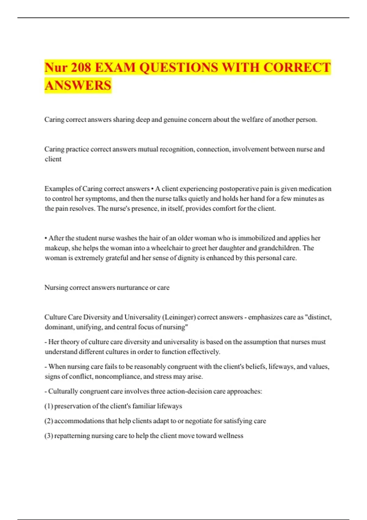 Nur 208 EXAM QUESTIONS WITH CORRECT ANSWERS