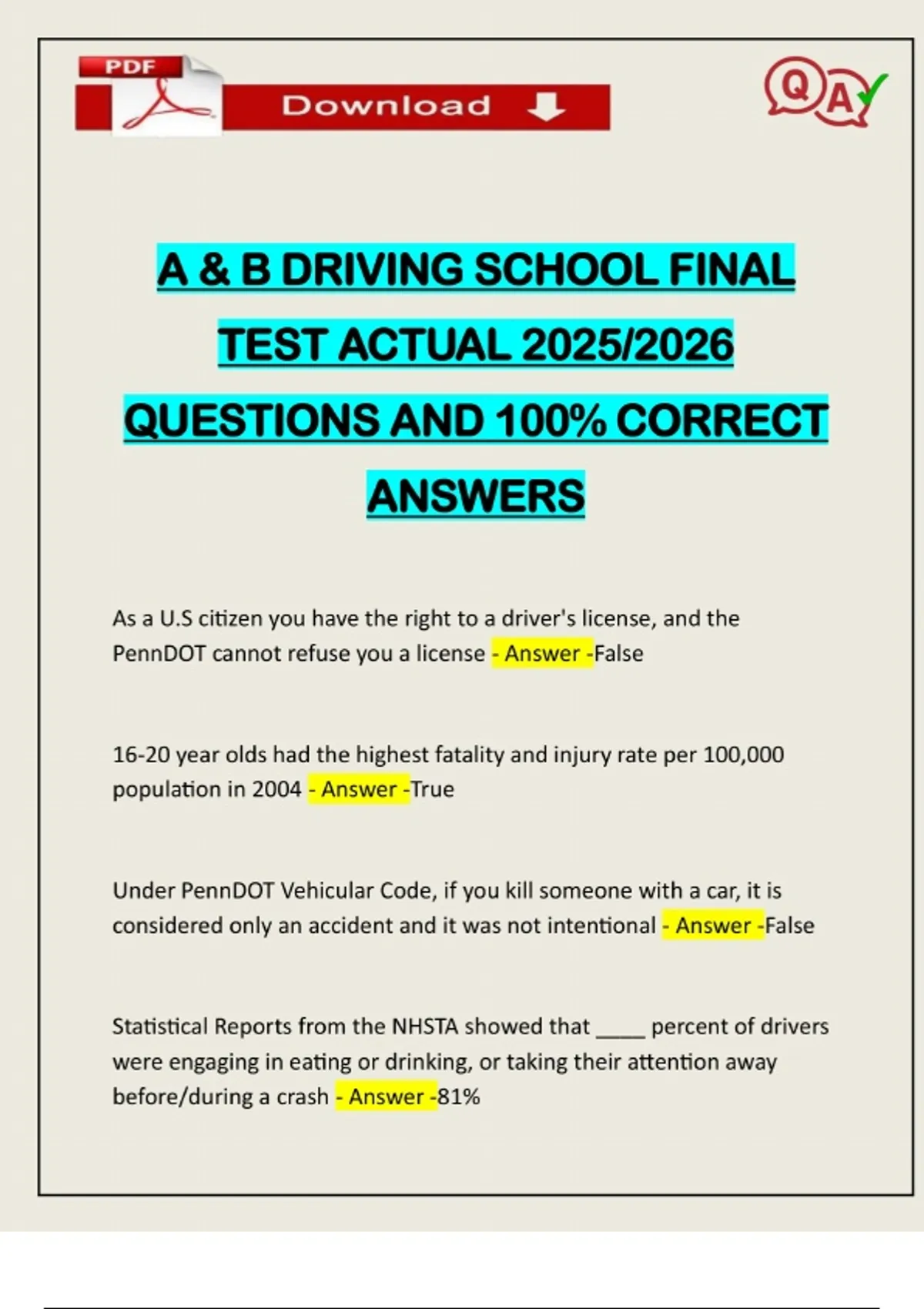 A & B DRIVING SCHOOL FINAL TEST ACTUAL 2025/2026 QUESTIONS AND 100% CORRECT ANSWERS As a U.S citizen you have the right to a driver's license, and the PennDOT cannot refuse you a license - Answer -False 16-20 year olds had the highest fatality and injury rate per 100,000 population in 2004 - Answer -True Under PennDOT Vehicular Code, if you kill someone with a car, it is considered only an accident and it was not intentional - Answer -False Statistical Reports from the NHSTA showed that ____ percent of drivers were engaging in eating or drinking, or taking their attention away before/during a crash - Answer -81%Need assistance on Online classes, Exams & Assignments? Reach out for instant help!! Full Course Assistance, Plagiarism-free Essay Writing, Research Paper, Dissertation, Discussion Posts, etc…. Confidential & Secure services. Tutors are available for all subjects! Email now at: A vehicle is capable of causing extensive property damage, injury and death. You should operate you vehicle with extreme caution because its like handling _______ - Answer -A loaded gun Its not our attitudes in how we use our cars that make them more dangerous than guns. Rather it is that cars are made of heavier materials than guns - Answer -False States with night time driving restrictions or curfews for young novice drivers do not experience lower crash rates than states without - Answer -False The crash rate for 16 year old drivers is _____ times that of 20-24 year old drivers - Answer -15 Teens are twice as likely as adult d