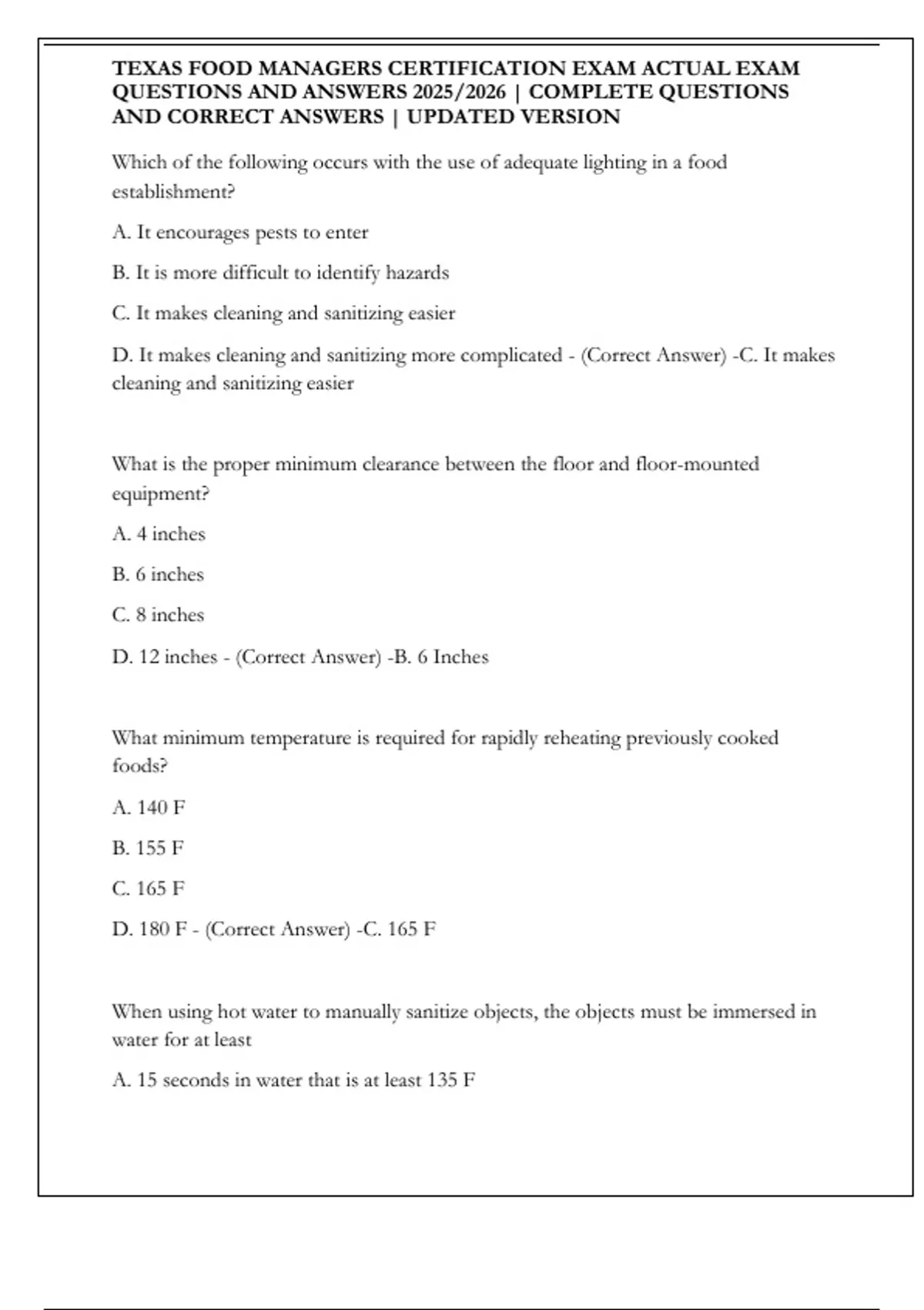 TEXAS FOOD MANAGERS CERTIFICATION EXAM ACTUAL EXAM QUESTIONS AND ANSWERS 2025/2026 | COMPLETE QUESTIONS AND CORRECT ANSWERS | UPDATED VERSION