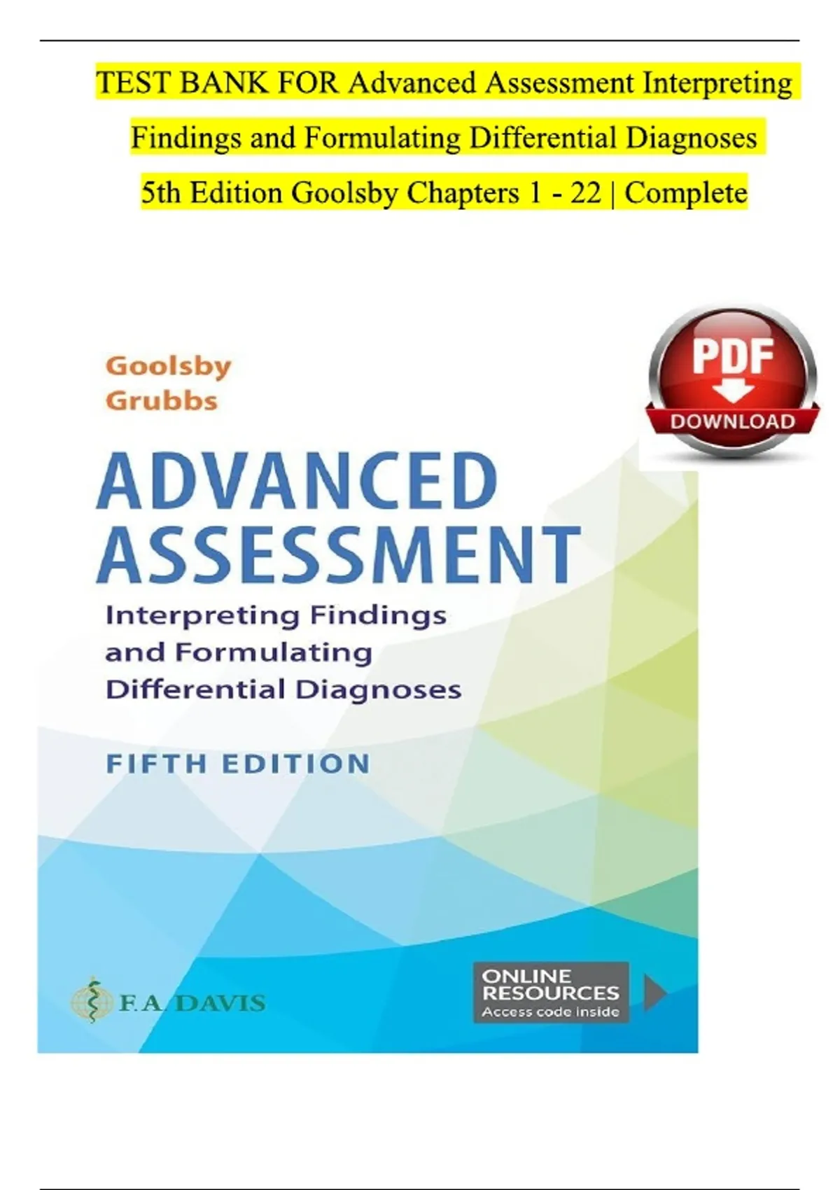 TEST BANK FOR Advanced Assessment Interpreting Findings and Formulating Differential Diagnoses 5th Edition Goolsby Chapters 1 - 22 | Complete