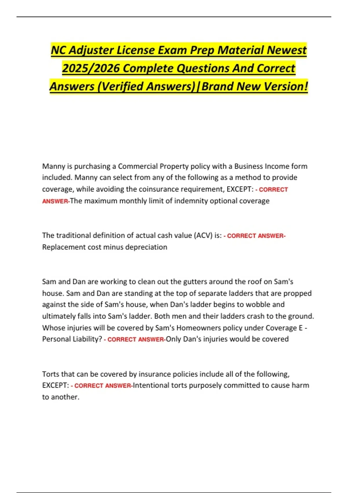 NC Adjuster License Exam Prep Material Newest 2025/2026 Complete Questions And Correct Answers (Verified Answers)|Brand New Version!
