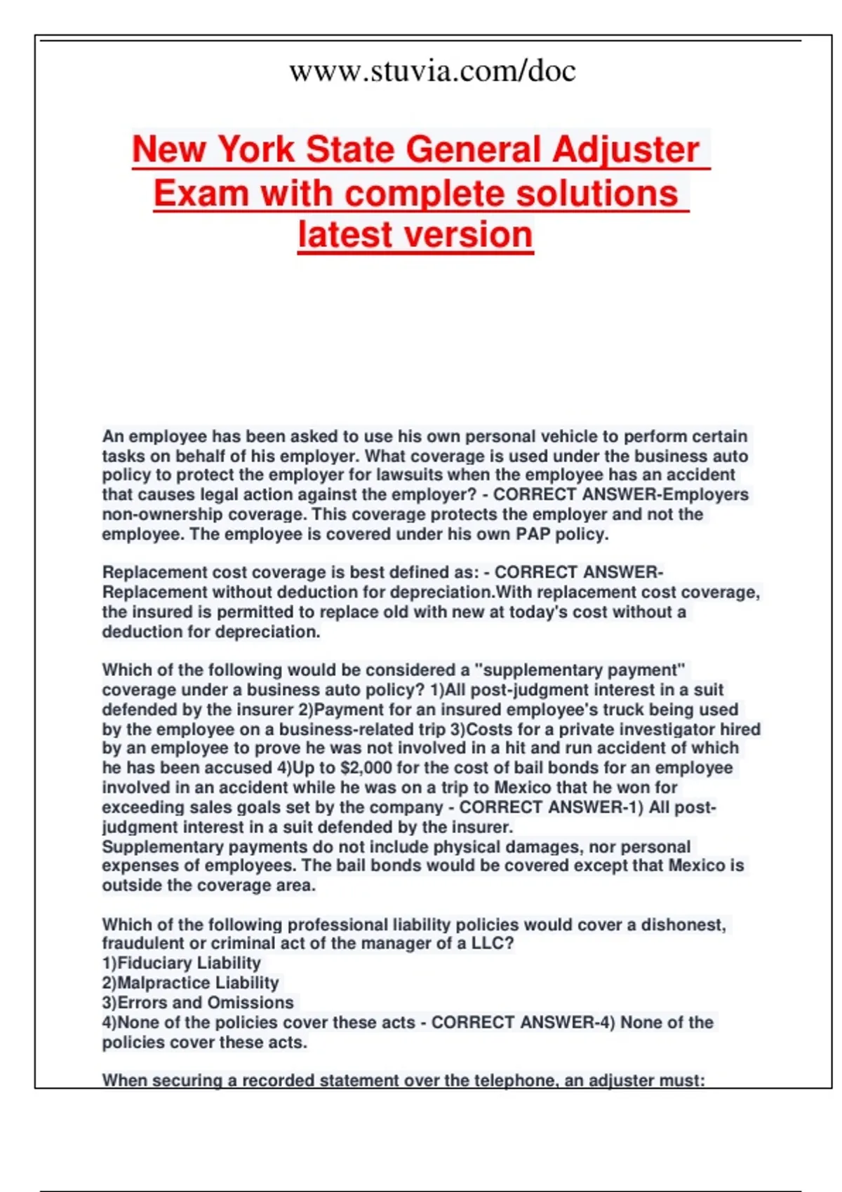New York State General Adjuster Exam with complete solutions latest version.