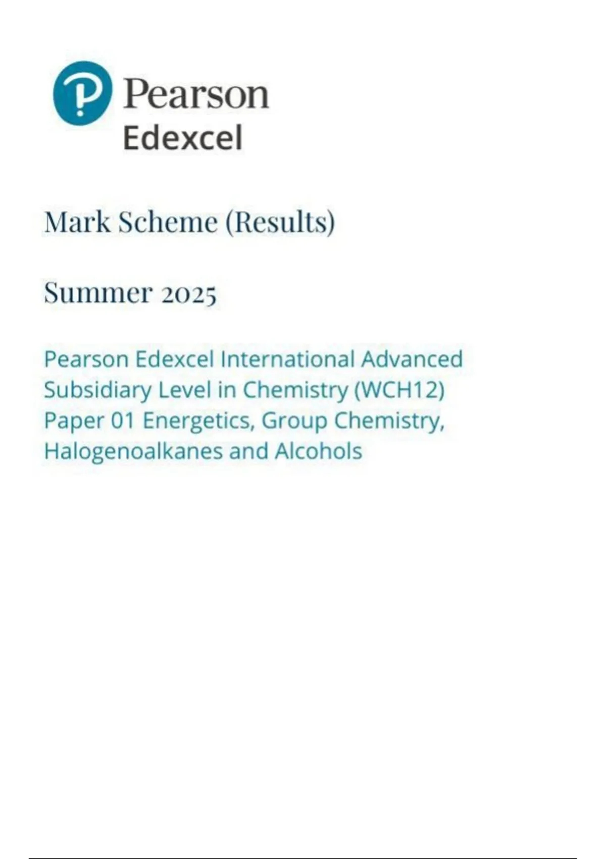 Pearson Edexcel IAL WCH12 01 Chemistry Unit 2: Energetics, Group Chemistry, Halogenoalkanes and Alcohols YEAR 2025.MARK SCHEME