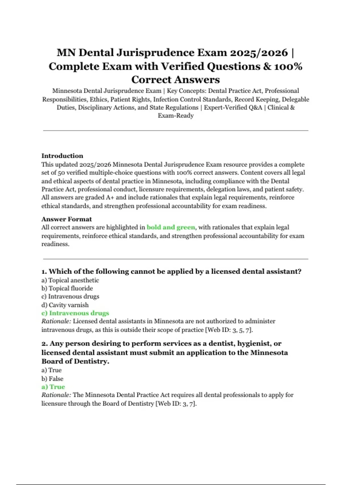 This document provides the complete set of verified questions and 100% correct answers for the Minnesota Dental Jurisprudence Exam. It covers all key concepts, including the Dental Practice Act, professional responsibilities, ethics, patient rights, infection control standards, record keeping, delegable duties, disciplinary actions, and state regulations. A thorough and exam-ready resource to prepare effectively and ensure full understanding of Minnesota’s dental laws and professional requirements.