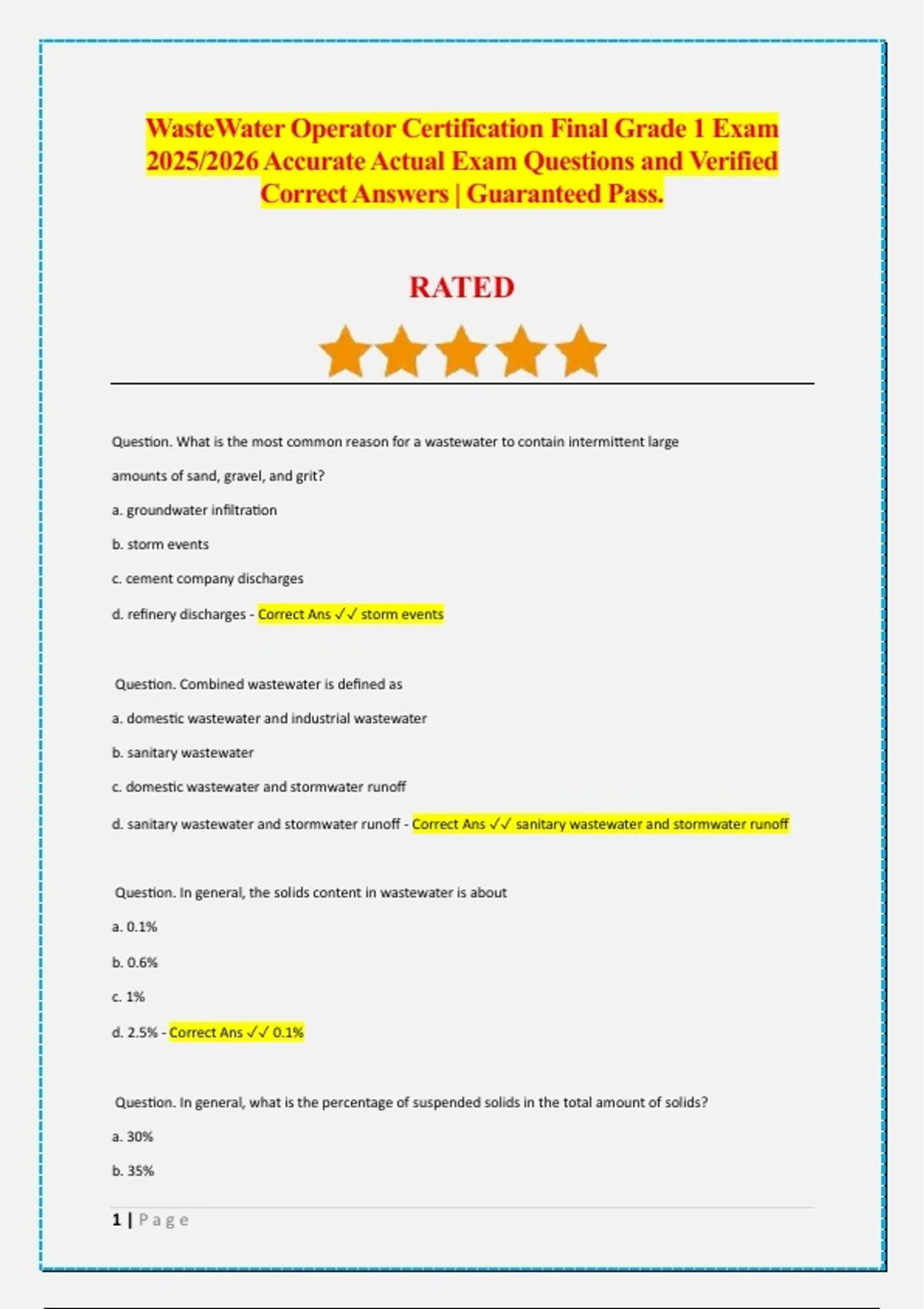 Download the latest updated version of Waste Water Operator Certification Final Grade 1 Exam 2025/2026 Accurate Actual Exam Questions and Verified Correct Answers | Guaranteed Pass.