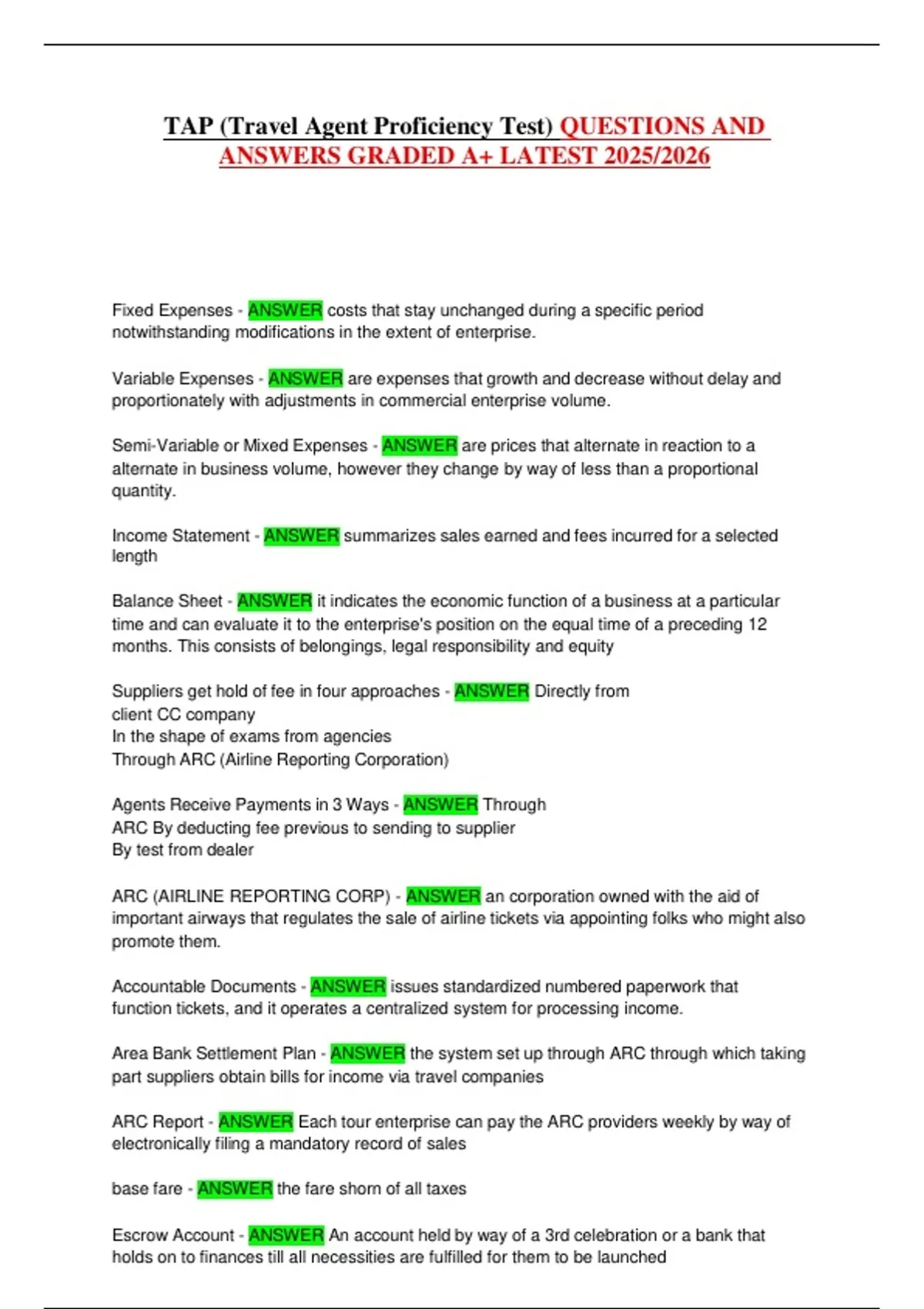 This document contains the full set of Travel Agent Proficiency (TAP) test questions and answers, updated for 2025/2026. It covers all essential areas including travel agency operations, financial basics, ARC procedures, geography, transportation, marketing, customer service, and industry regulations. The material is structured in a Q&A format with detailed explanations, making it ideal for exam preparation and professional certification review.