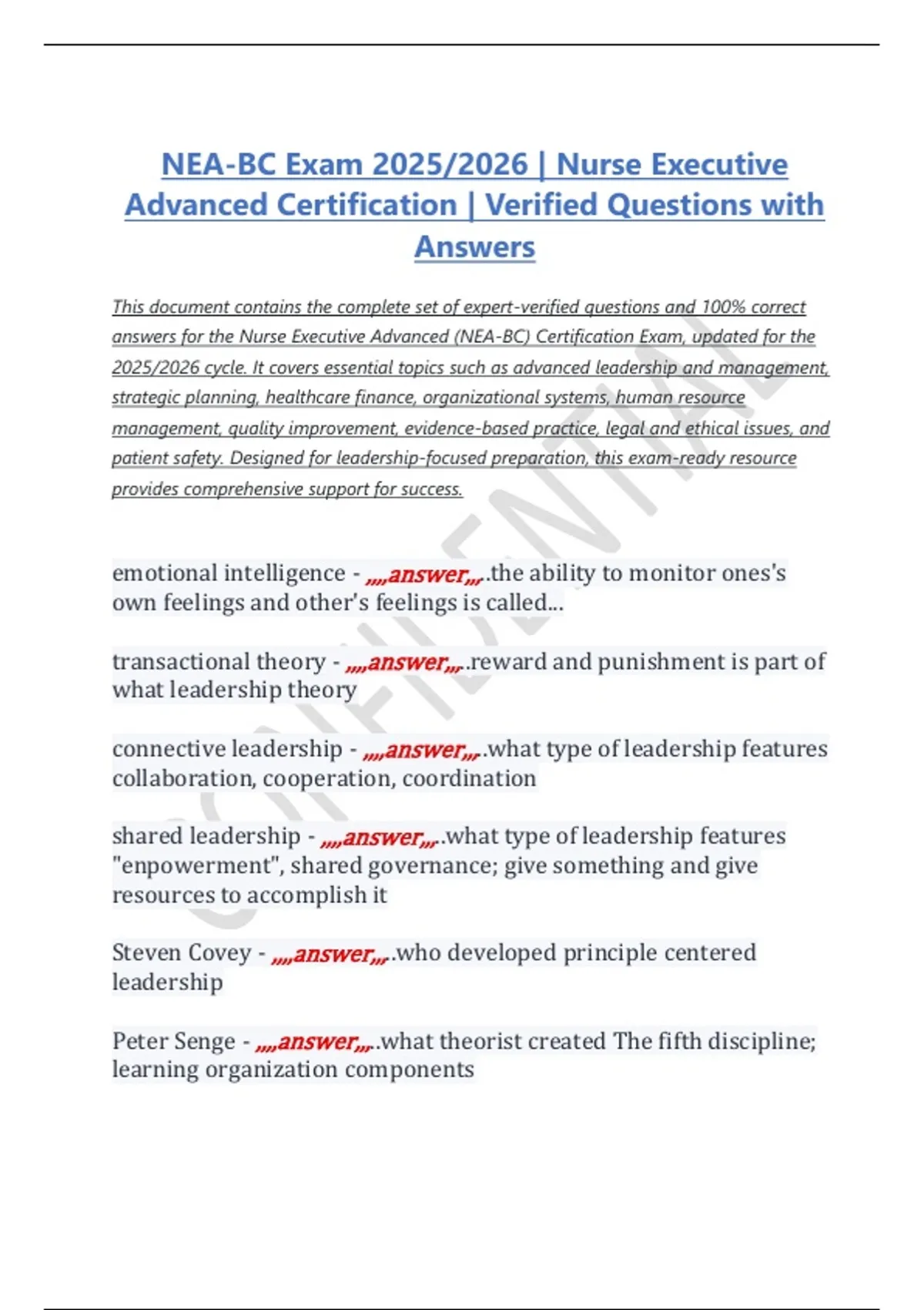 answers for the Nurse Executive Advanced (NEA-BC) Certification Exam, updated for the