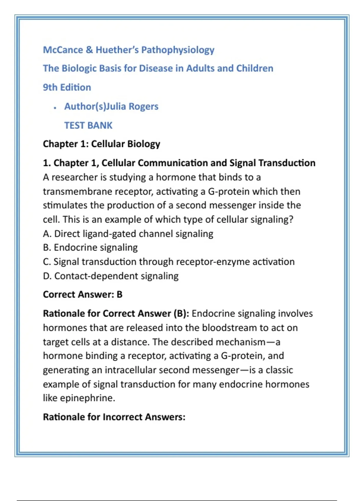 Test Bank for McCance & Huether’s Pathophysiology 9th Edition Julia Rogers | Chapter-by-Chapter | Verified Answers & Rationales | Certification-Aligned | Guaranteed Pass McCance & Huether’s Pathophysiology 9th Edition Test Bank | Complete Chapter Coverage | Expertly Verified Q&A | Exam-Ready | 100% Pass Assurance Stuvia Listing Description Unlock Your Path to Success with the Ultimate Test Bank for McCance & Huether’s Pathophysiology, 9th Edition! Fully Updated for the 9th Edition – This test bank meticulously covers every chapter of the classic textbook by Julia Rogers, ensuring alignment with the latest content and clinical updates. Verified Answers & Rationales – Each question includes accurate answers and detailed rationales, explaining both correct and incorrect options to deepen your understanding of complex pathophysiology concepts. Chapter-by-Chapter Organization – Perfect for focused study sessions and self-assessment. Topics include cellular biology, genetic disorders, immune responses, metabolic imbalances, and system-specific diseases. Certification Exam Alignment – Designed to mirror the format and rigor of leading nursing and medical exams (e.g., NCLEX, USMLE), helping you build confidence and critical thinking skills. Guaranteed Pass – Students who use this resource report higher exam scores and improved comprehension. Join thousands of successful learners who have aced their courses and certifications! Ideal For Nursing and medical students Pathophysiology course review Exam preparation (e.g., NCLEX, HESI, USMLE) Educators seeking reliable assessment materials Instant Digital Download – Get immediate access after purchase and start studying anytime, anywhere! Disclaimer: This test bank is a supplementary study resource and is not affiliated with the publisher or authors. It is intended for educational use only. 10 High-Converting Hashtags for Stuvia #PathophysiologyTestBank #McCanceAndHuether #NursingExamPrep #NCLEXStudyGuide #MedicalStudentResources #Pathophysiology9thEdition #GuaranteedPass #ChapterByChapter #VerifiedTestBank #StuviaTopSeller 8 SEO Keywords McCance & Huether test bank Pathophysiology 9th Edition test bank Nursing pathophysiology exam prep Verified pathophysiology Q&A Chapter-by-chapter test bank NCLEX pathophysiology questions Medical biology test bank Julia Rogers pathophysiology resources
