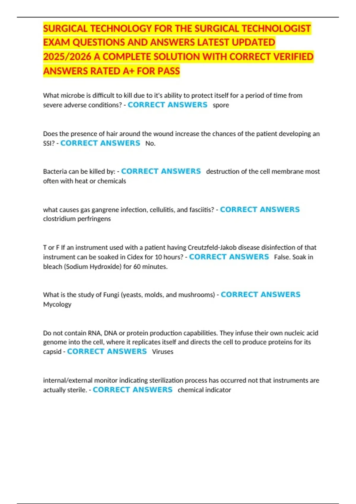 SURGICAL TECHNOLOGY FOR THE SURGICAL TECHNOLOGIST EXAM QUESTIONS AND ANSWERS LATEST UPDATED 2025/2026 A COMPLETE SOLUTION WITH CORRECT VERIFIED ANSWERS RATED A+ FOR PASS