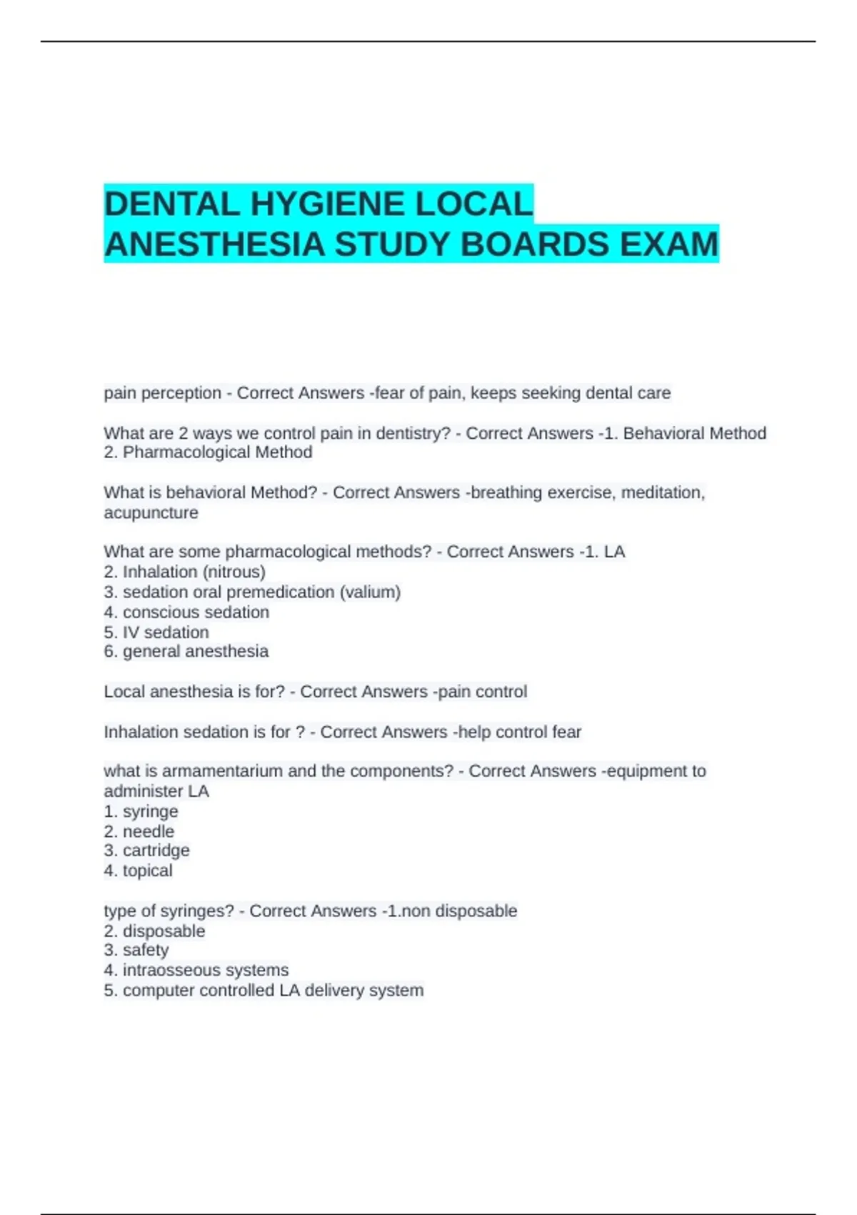 DENTAL HYGIENE LOCAL ANESTHESIA STUDY BOARDS EXAM WITH ACCURATE ANSWERS