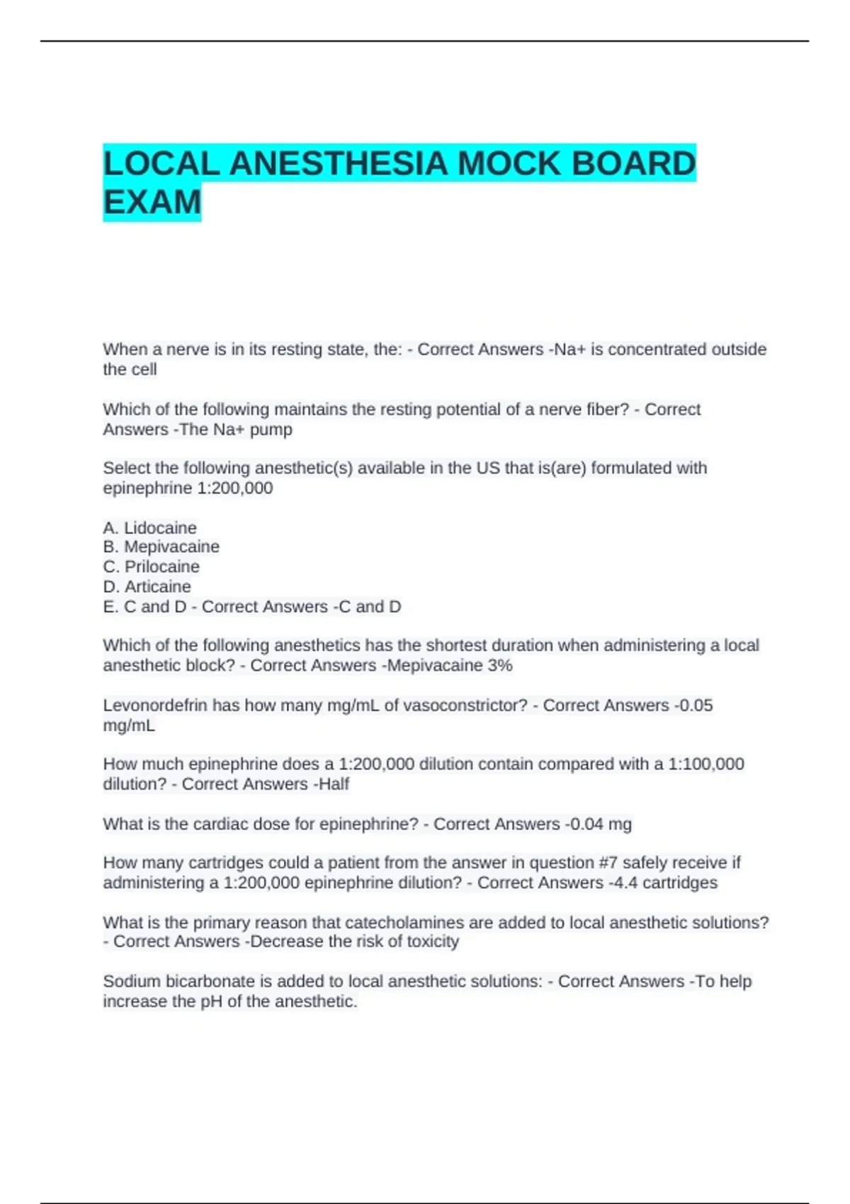 LOCAL ANESTHESIA MOCK BOARD EXAM QUESTIONS AND ANSWERS