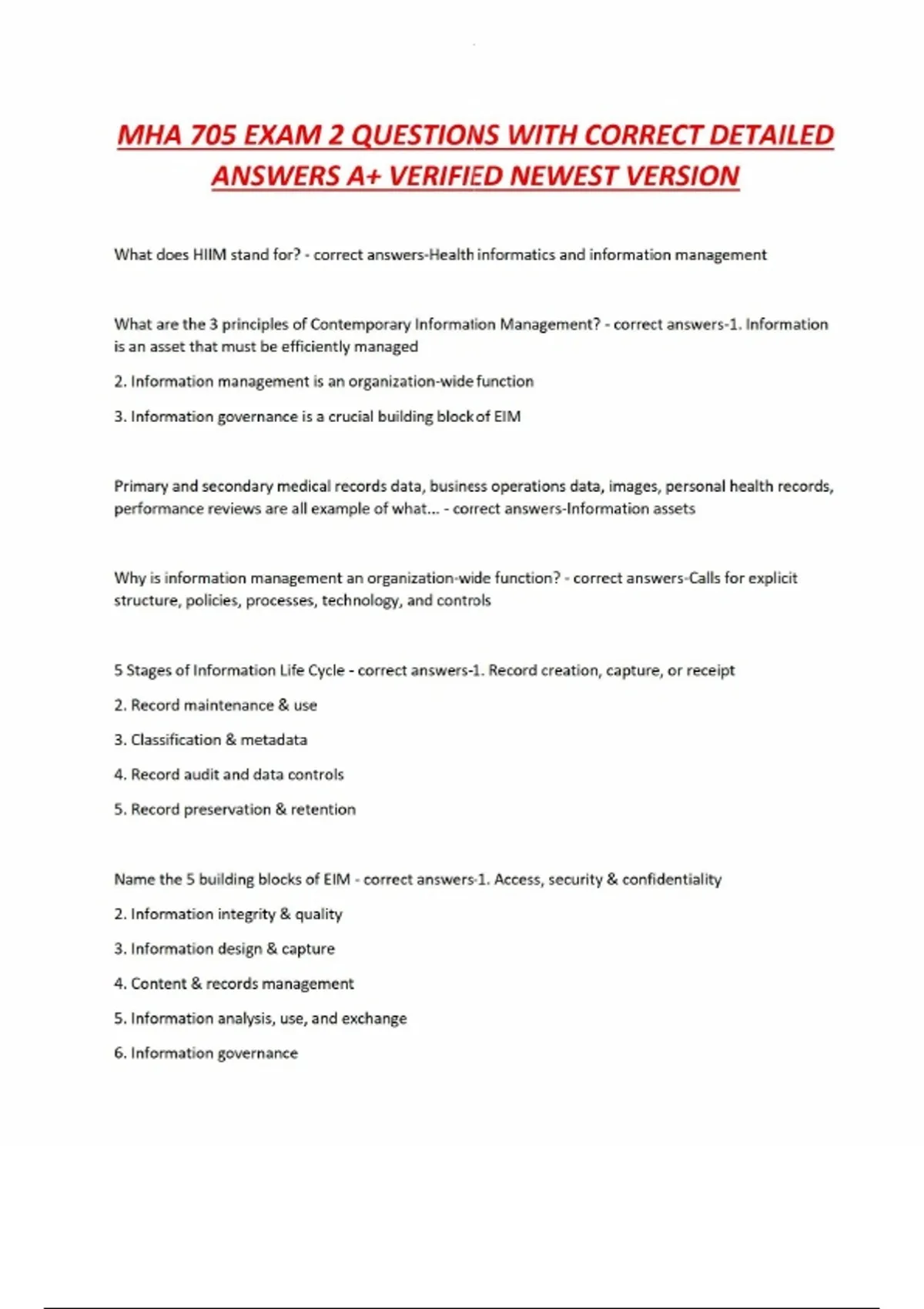 MHA 705 EXAM 2 QUESTIONS WITH CORRECT DETAILED ANSWERS A+ VERIFIED NEWEST VERSION What does HIIM stand for? - correct answers-Health informatics and information management What are the 3 principles of Contemporary Information Management? - correct answers-1. Information is an asset that must be efficiently managed 2. Information management is an organization-wide function 3. Information governance is a crucial building block of EIM Primary and secondary medical records data, business operations data, images, personal health records, performance reviews are all example of what... - correct answers-Information assets