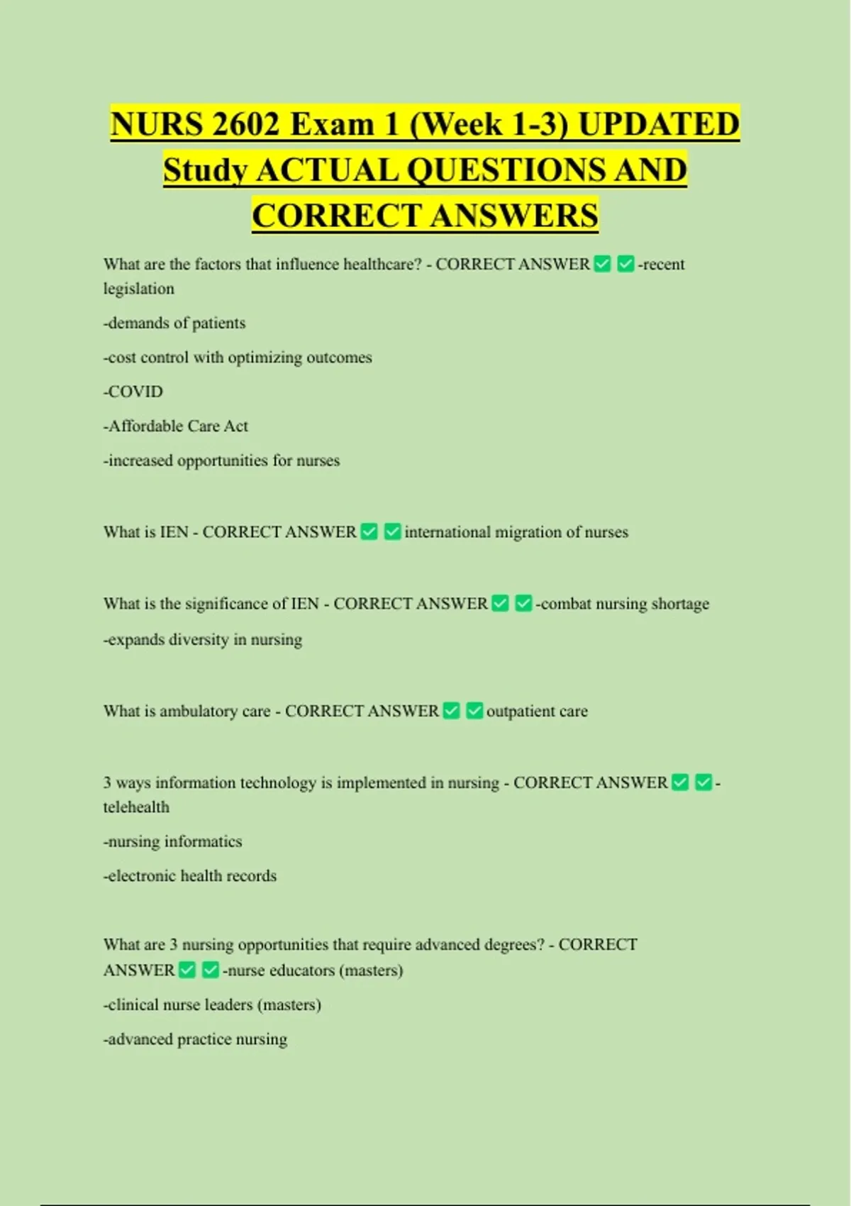 NURS 2602 Exam 1 (Week 1-3) UPDATED Study ACTUAL QUESTIONS AND CORRECT ANSWERS What are the factors that influence healthcare? - CORRECT ANSWER legislation -demands of patients -cost control with optimizing outcomes -COVID -Affordable Care Act -increased opportunities for nurses What is IEN - CORRECT ANSWER international migration of nurses What is the significance of IEN - CORRECT ANSWER -recent -combat nursing shortage -expands diversity in nursing