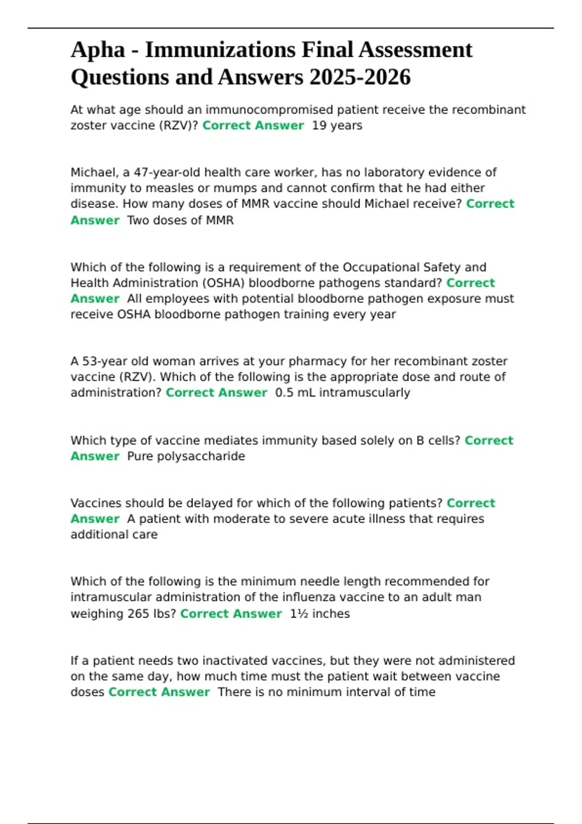 Apha - Immunizations Final Assessment Questions and Answers