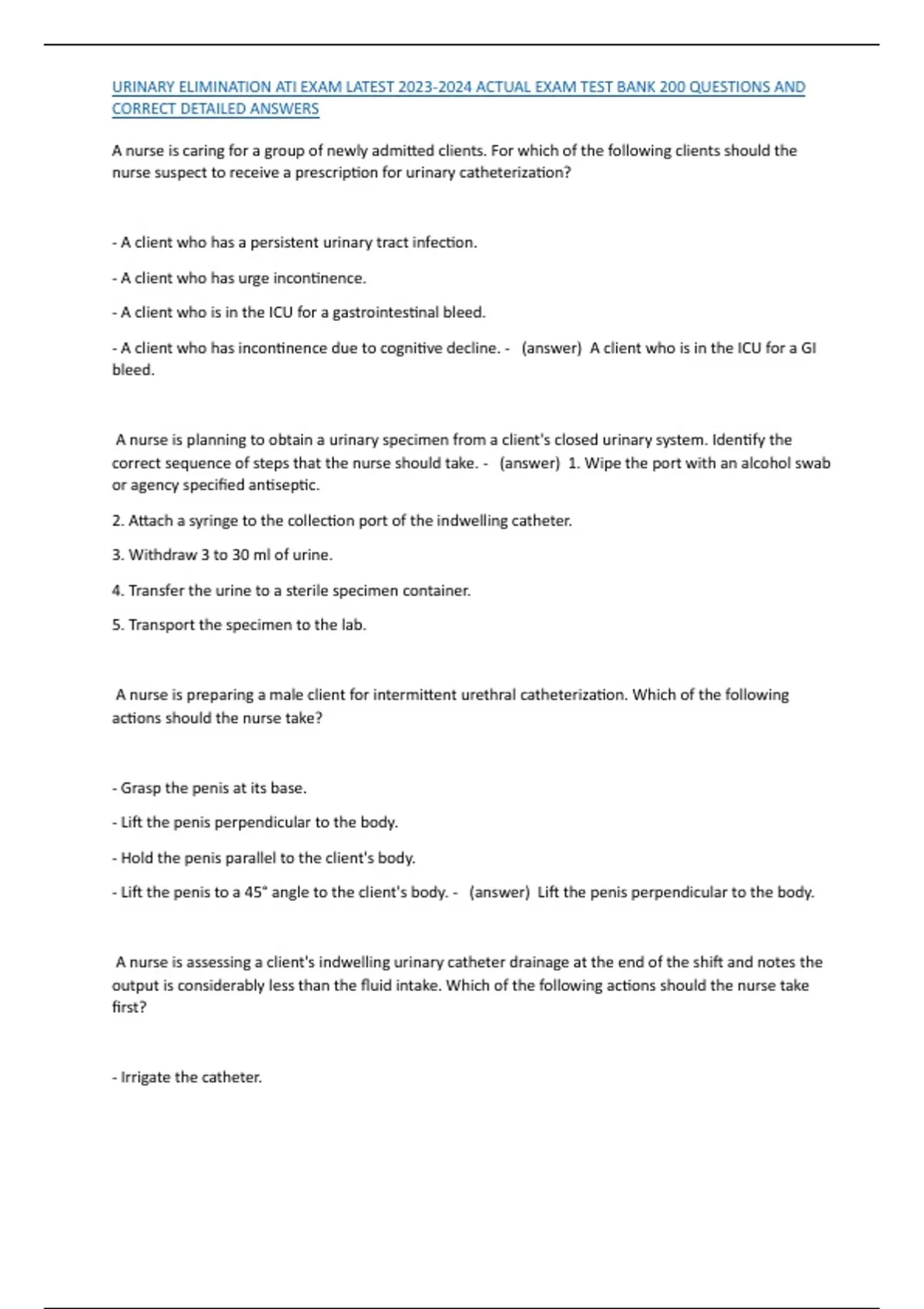 , URINARY ELIMINATION ATI EXAM LATEST 2023-2024 ACTUAL EXAM TEST BANK 200 QUESTIONS AND