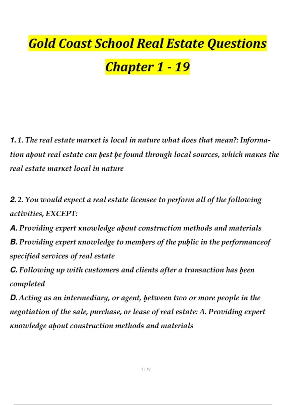 This comprehensive question set from Gold Coast School covers Chapters 1–19 of Real Estate fundamentals. It includes multiple-choice, true/false, and scenario-based questions with verified answers, designed to help students master key concepts in property law, sales, valuation, agency, and real estate practices. Ideal for exam preparation, review sessions, or self-assessment in real estate courses. real estate, Gold Coast School, RE101, property law, real estate sales, agency, valuation, exam questions, chapters 1-19, study guide