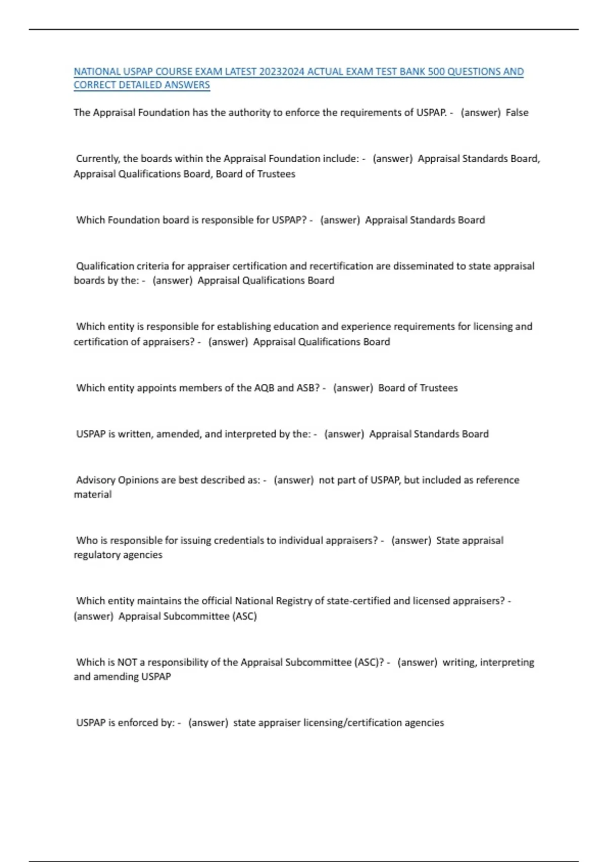 , NATIONAL USPAP COURSE EXAM LATEST 20232024 ACTUAL EXAM TEST BANK 500 QUESTIONS AND